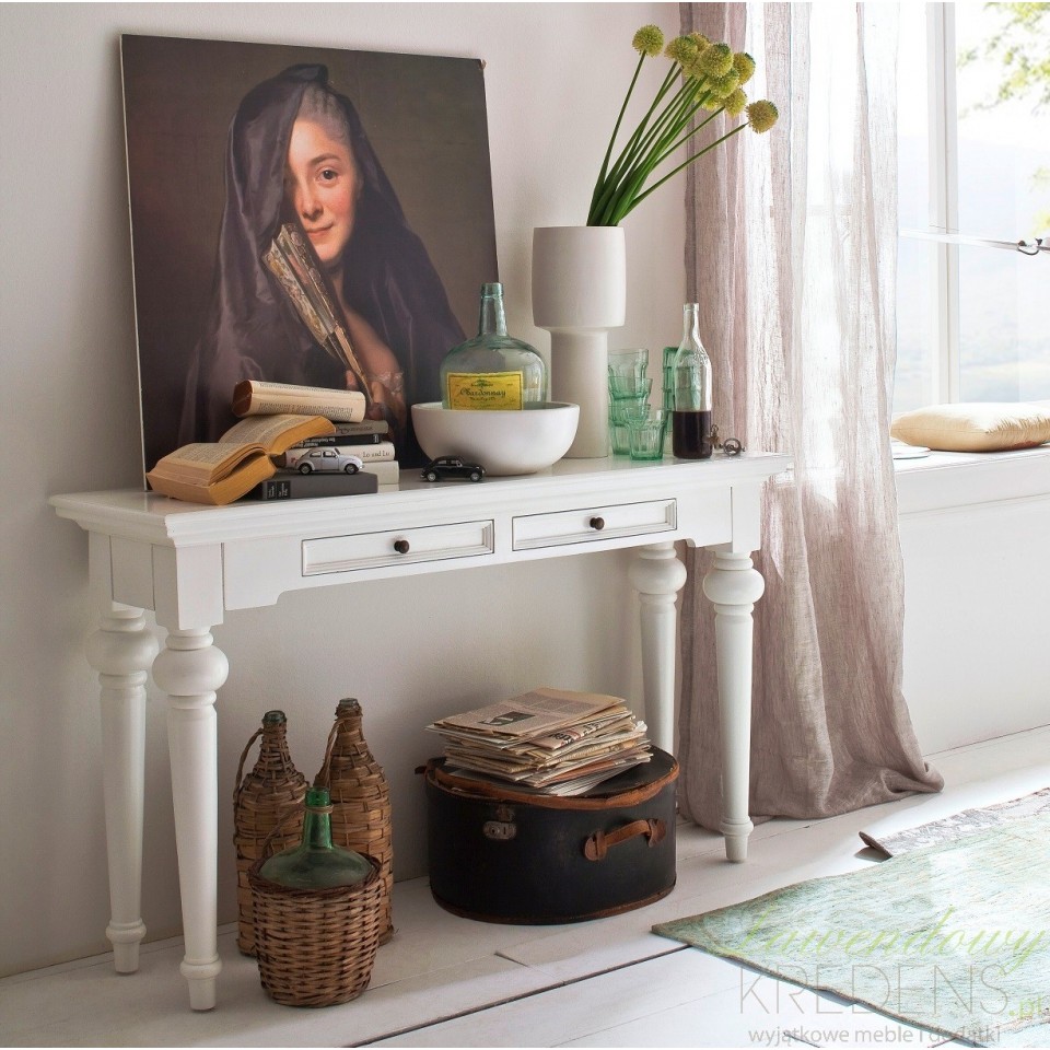 Konsola w stylu prowansalskim z dwiema szufladkami. Konsola prowansalska w kolorze białym została wykonana z mahoniu, który jest odporny na wilgoć oraz niekorzystne czynniki zewnętrzne. Elegancka konsola to piękny mebel, który będzie pasował zarówno w salonie jak i na korytarzu. Meble prowansalskie to klasa sama w sobie. My je uwielbiamy i polecamy!