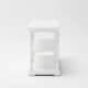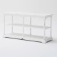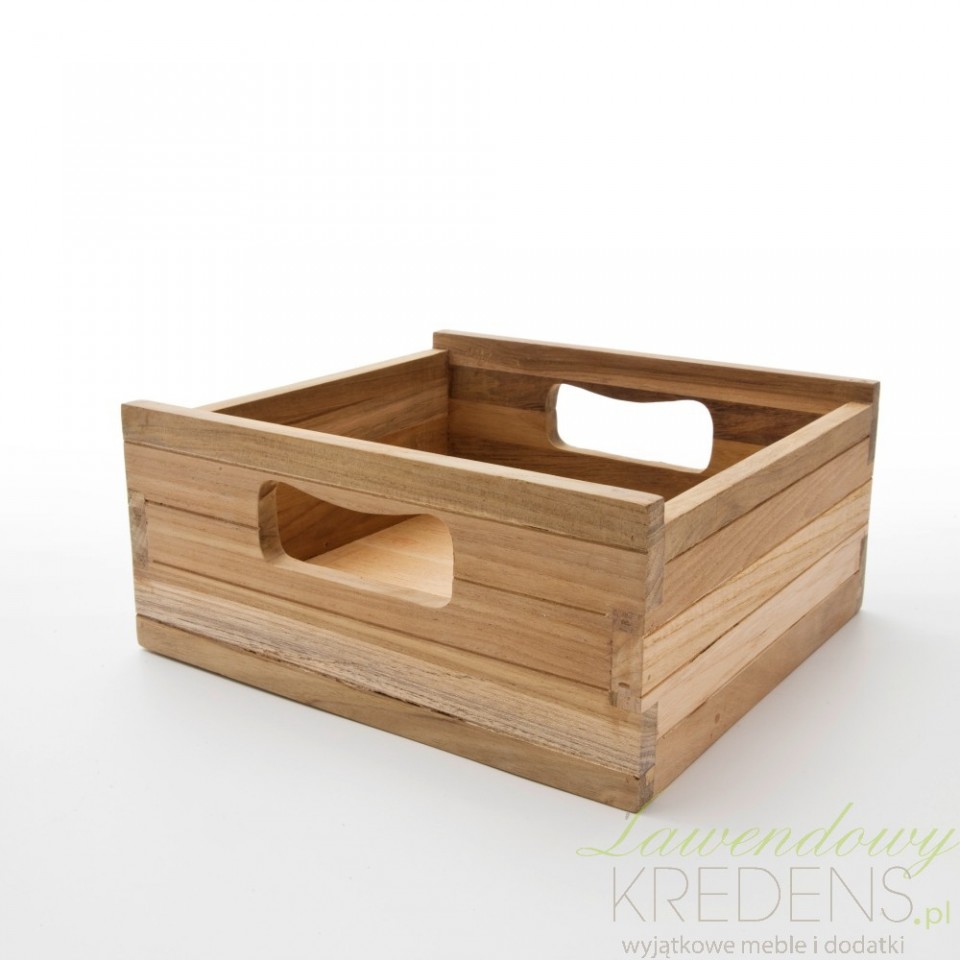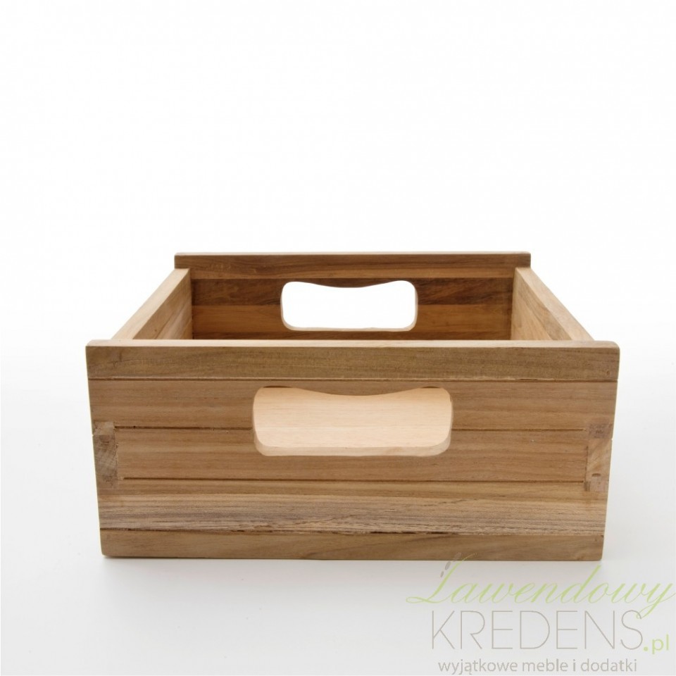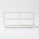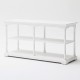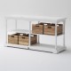 Biała konsola w stylu prowansalskim wyposażona w cztery skrzynki brązowe, posiadająca widoczne słoje i poręcznymi uchwytami.