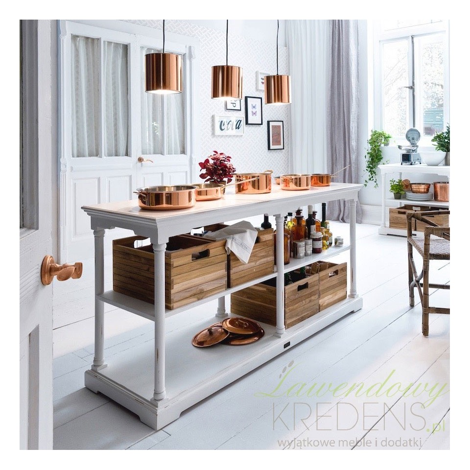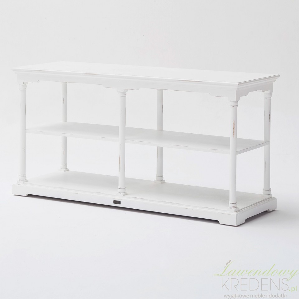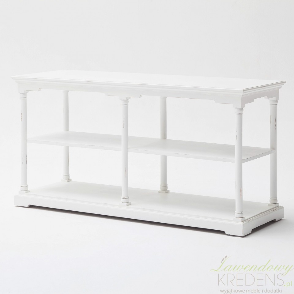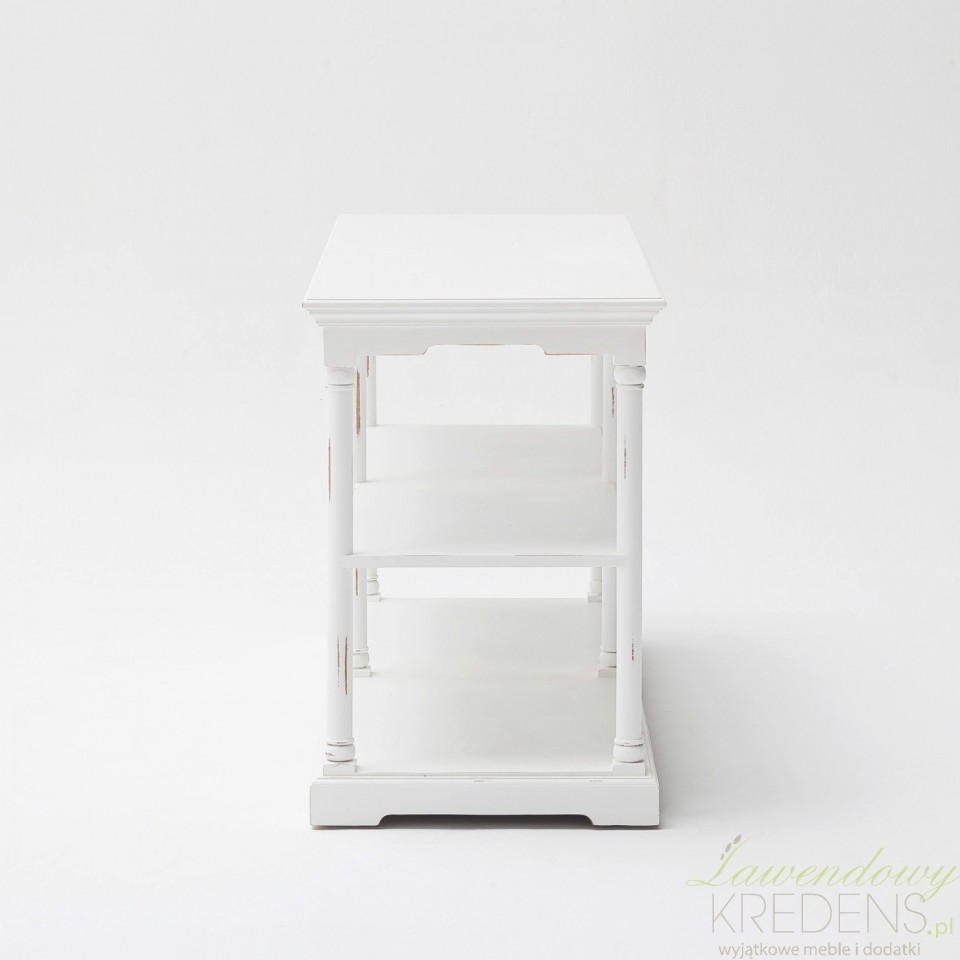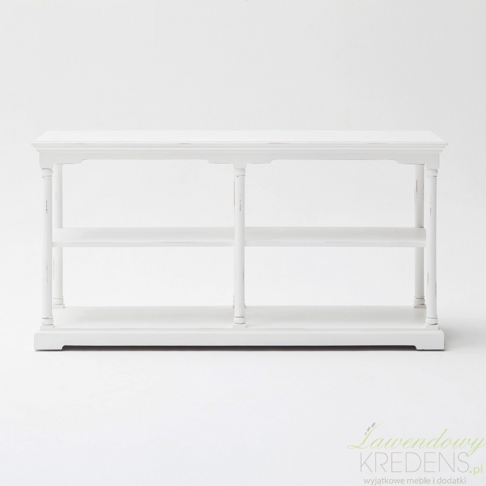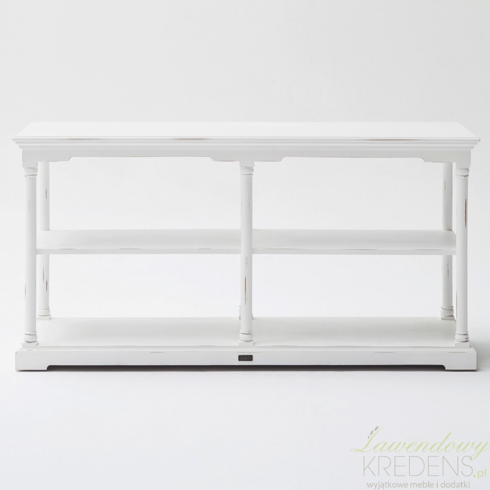 Konsola prowansalska Lumi z prostymi nóżkami. Jest szeroka na 160cm, ma biały kolor i miejscowe przecierki podkreślające jej francuski design. Konsola w stylu prowansalskim to jednocześnie ogromna przestrzeń użytkowa obejmująca długą półkę i cztery skrzynki drewniane. Praktyczne meble prowansalskie - musisz je mieć!