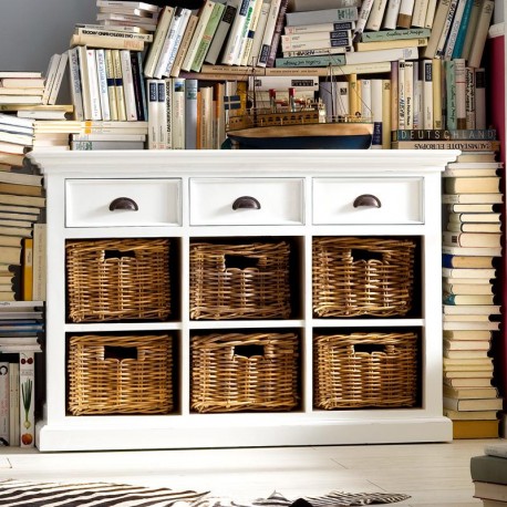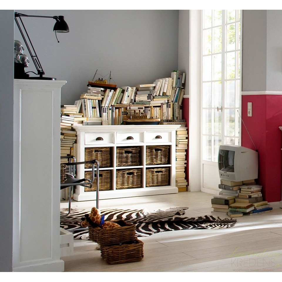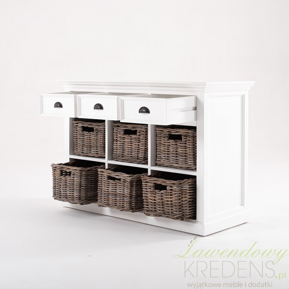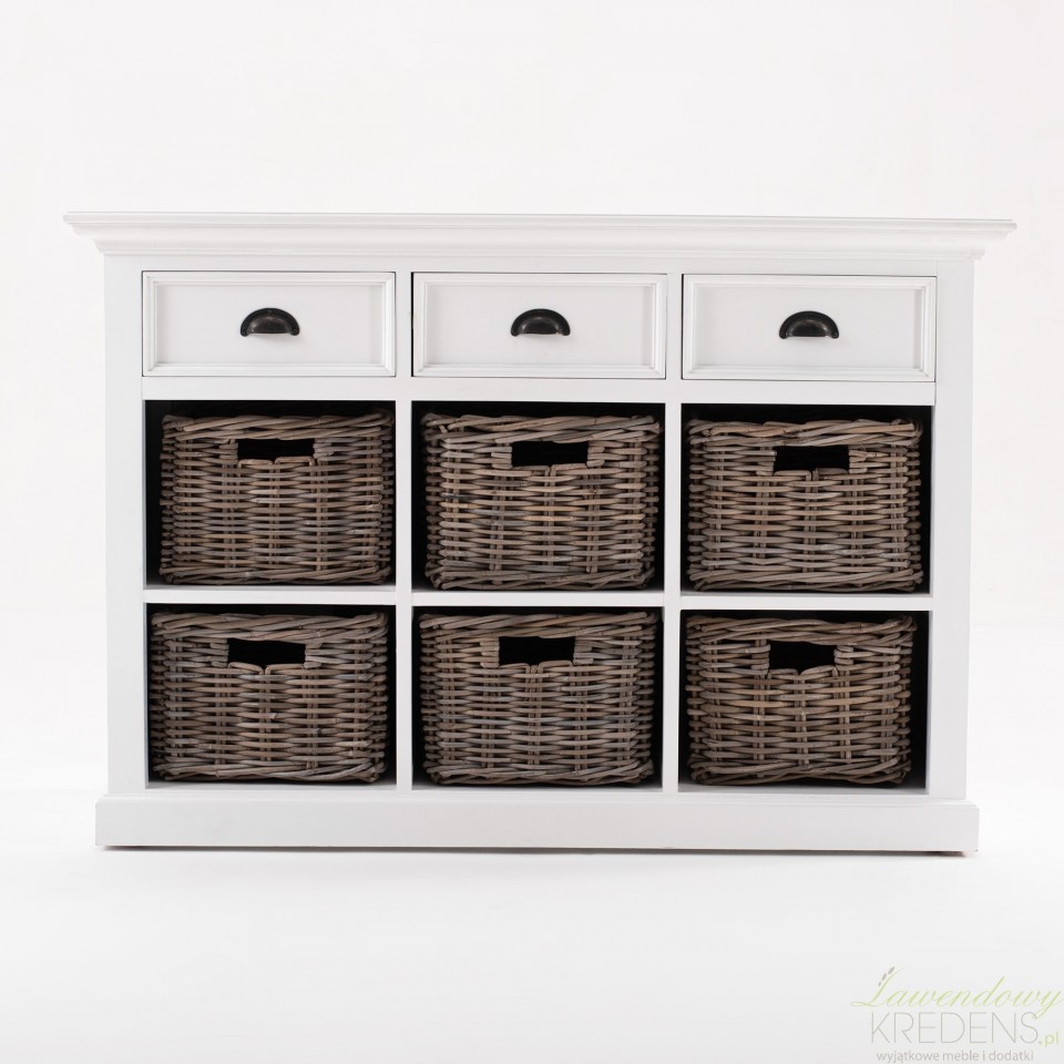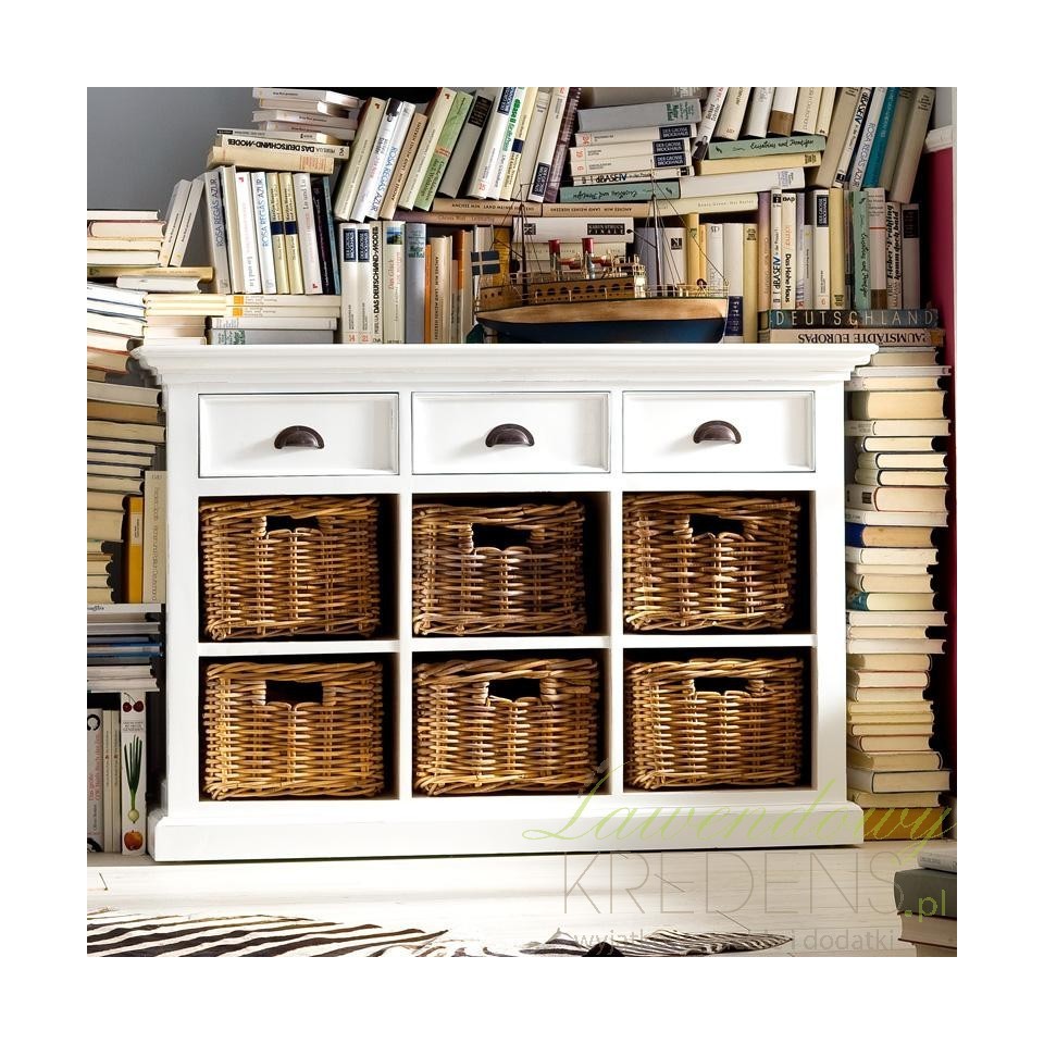 Stylowa komoda w stylu prowansalskim z koszami zamiast szuflad jest odpowiednim meblem do wykorzystania w salonie i w jadalni. Pojemna i piękna - taka o jakiej marzyłeś!