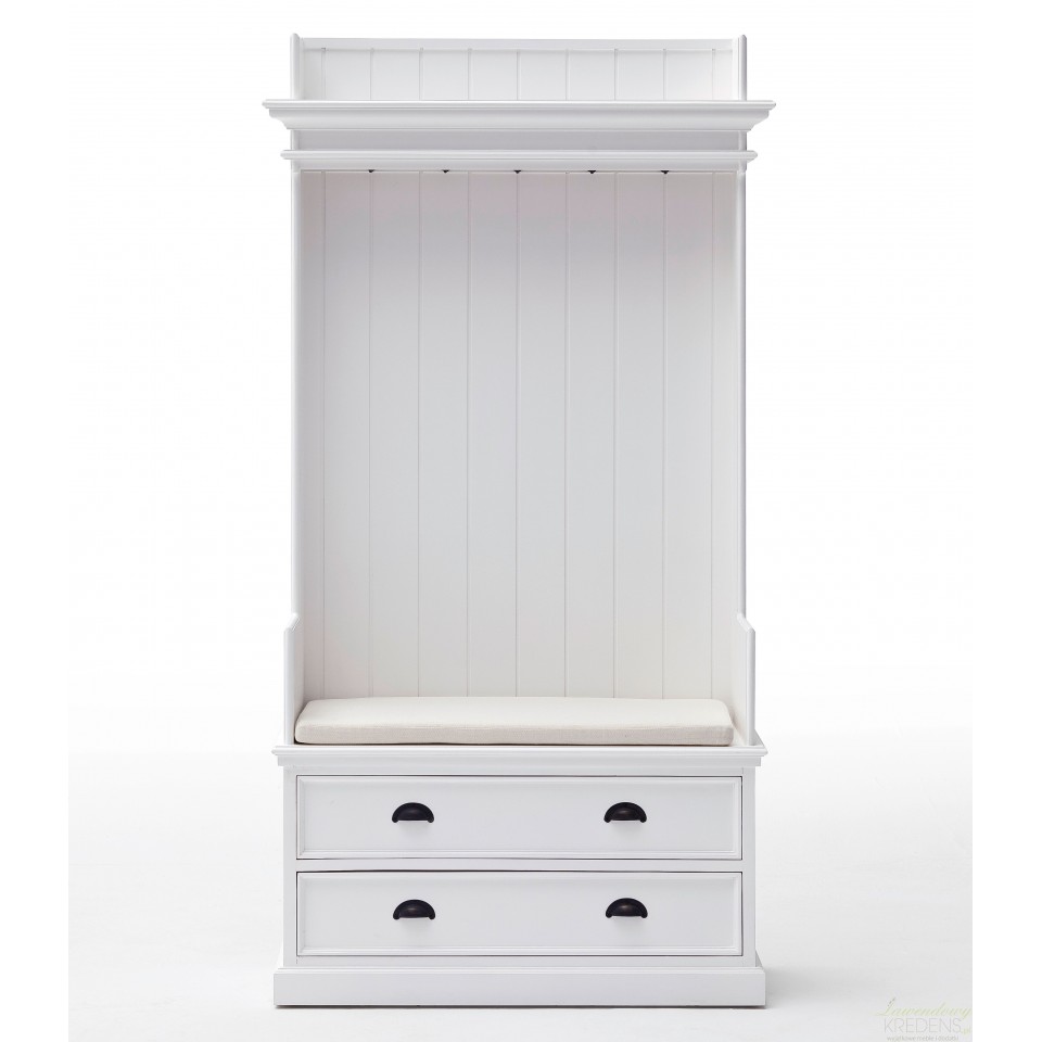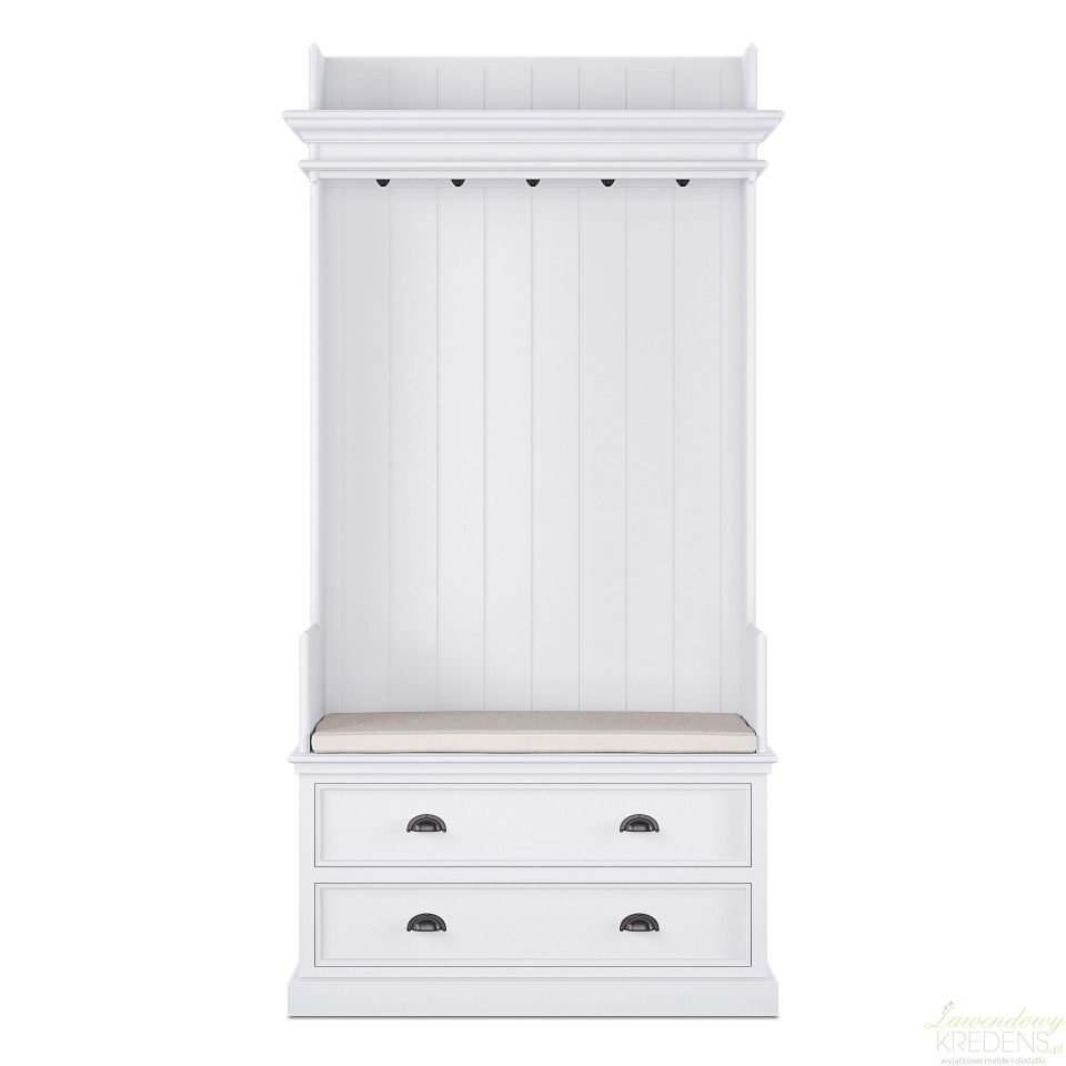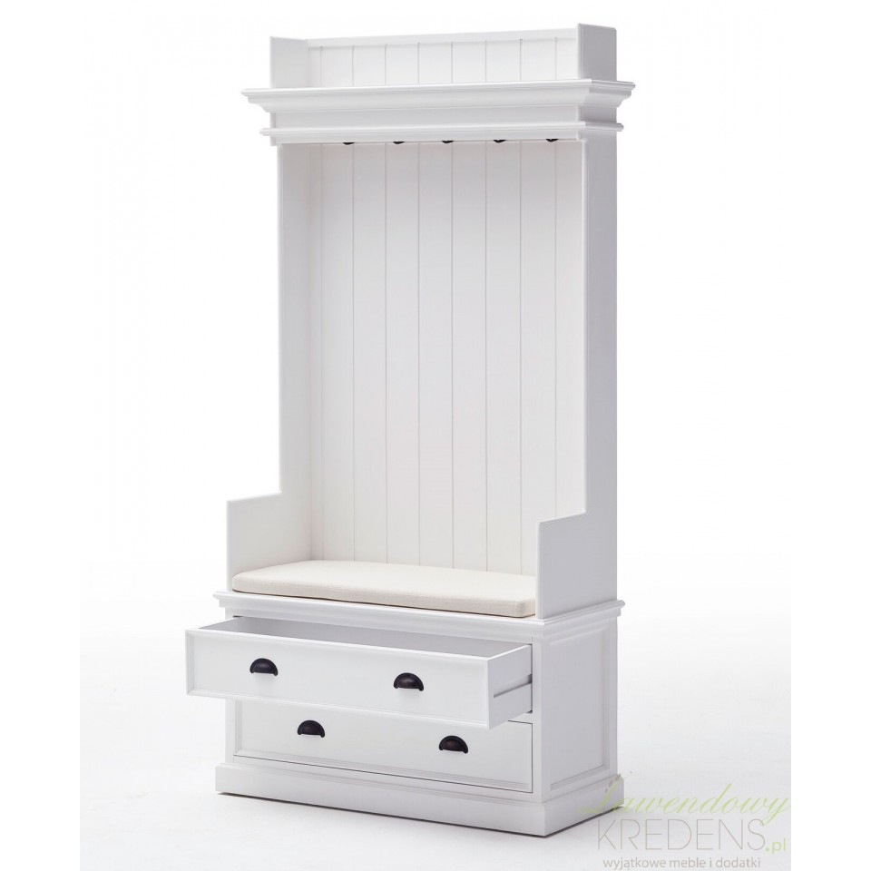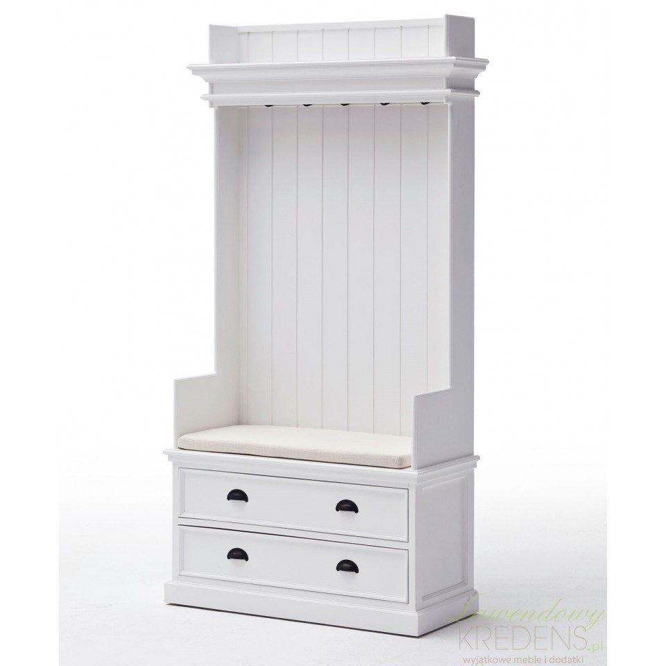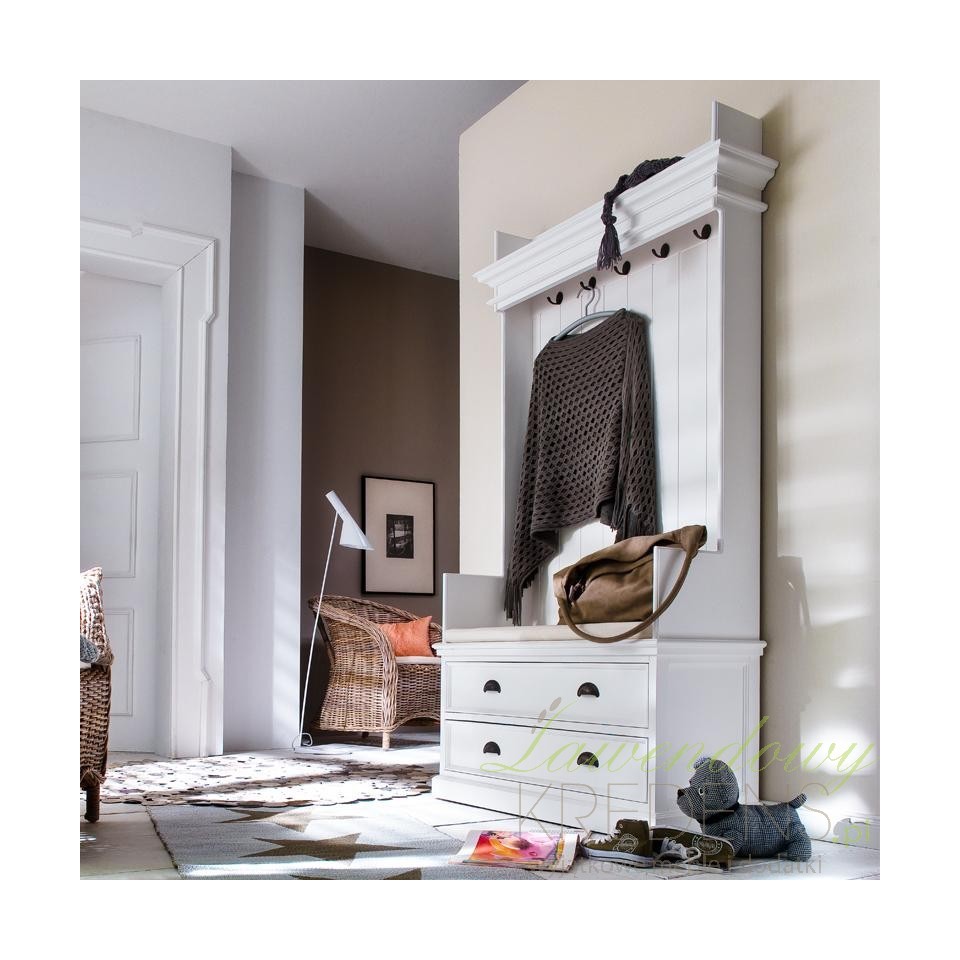 Wysoka, wielofunkcyjna komoda w stylu prowansalskim, to trzy meble w jednym! Wieszak, siedzisko i szuflady - niezbędne w przedpokoju.