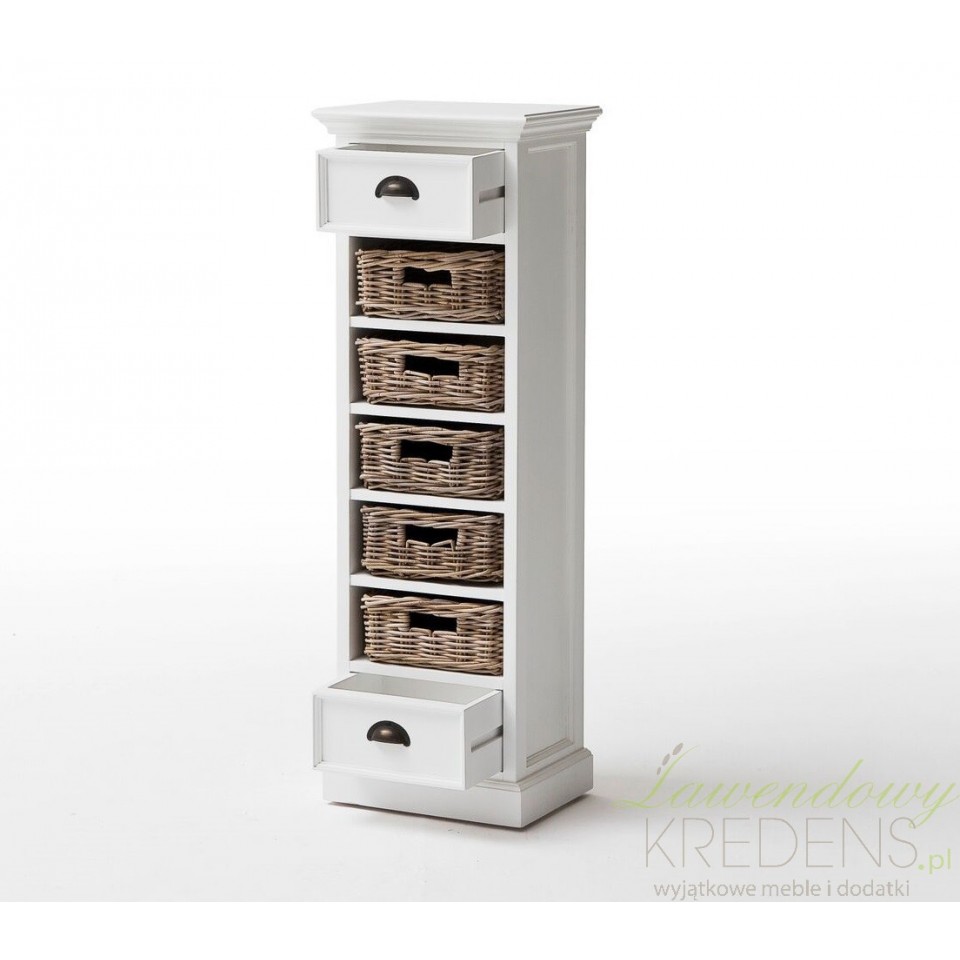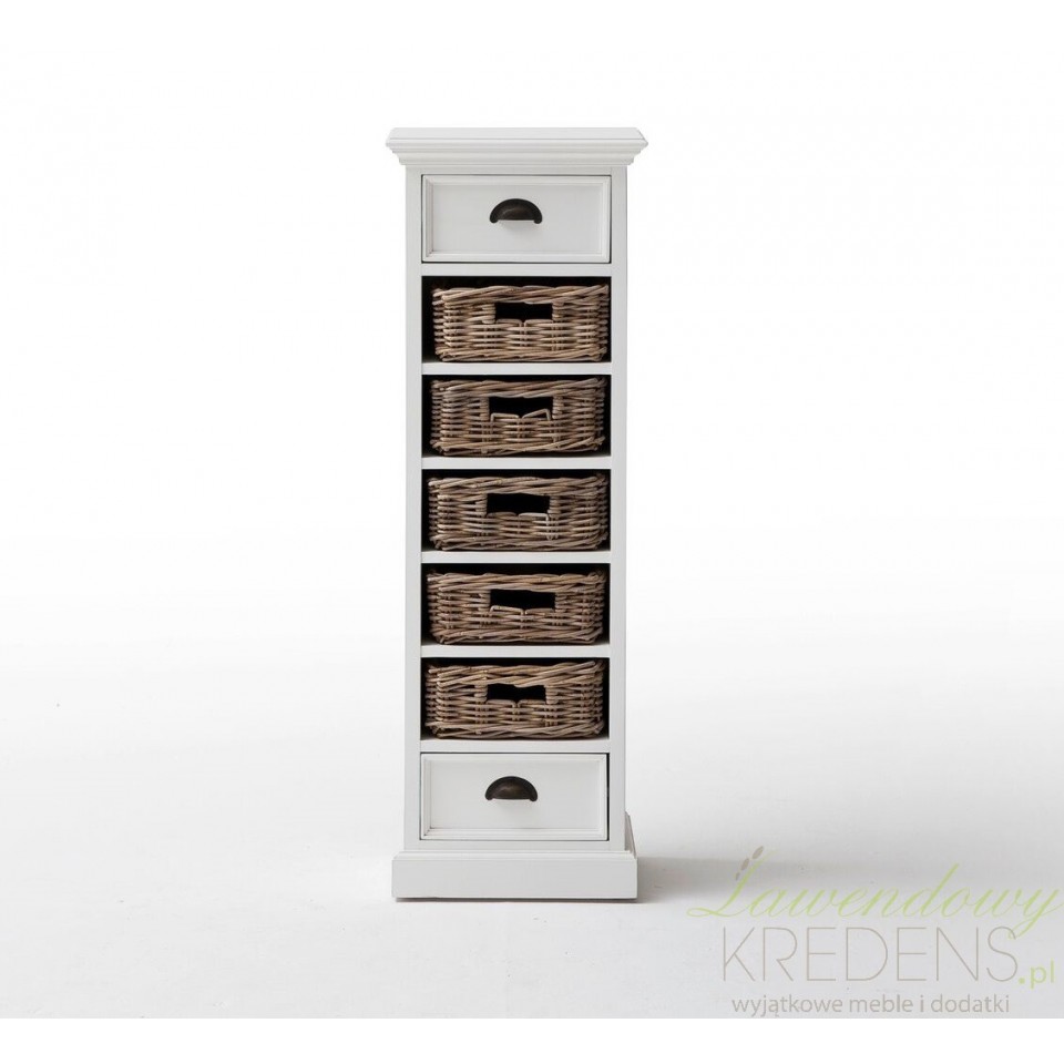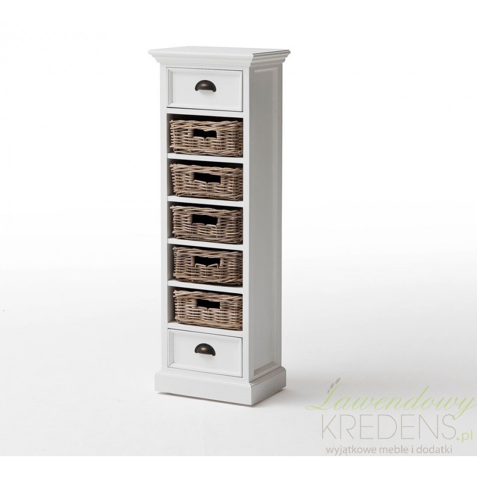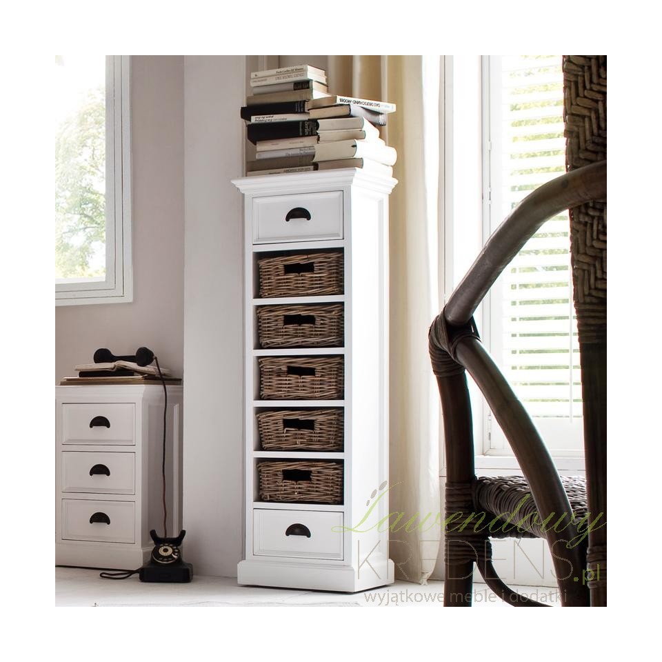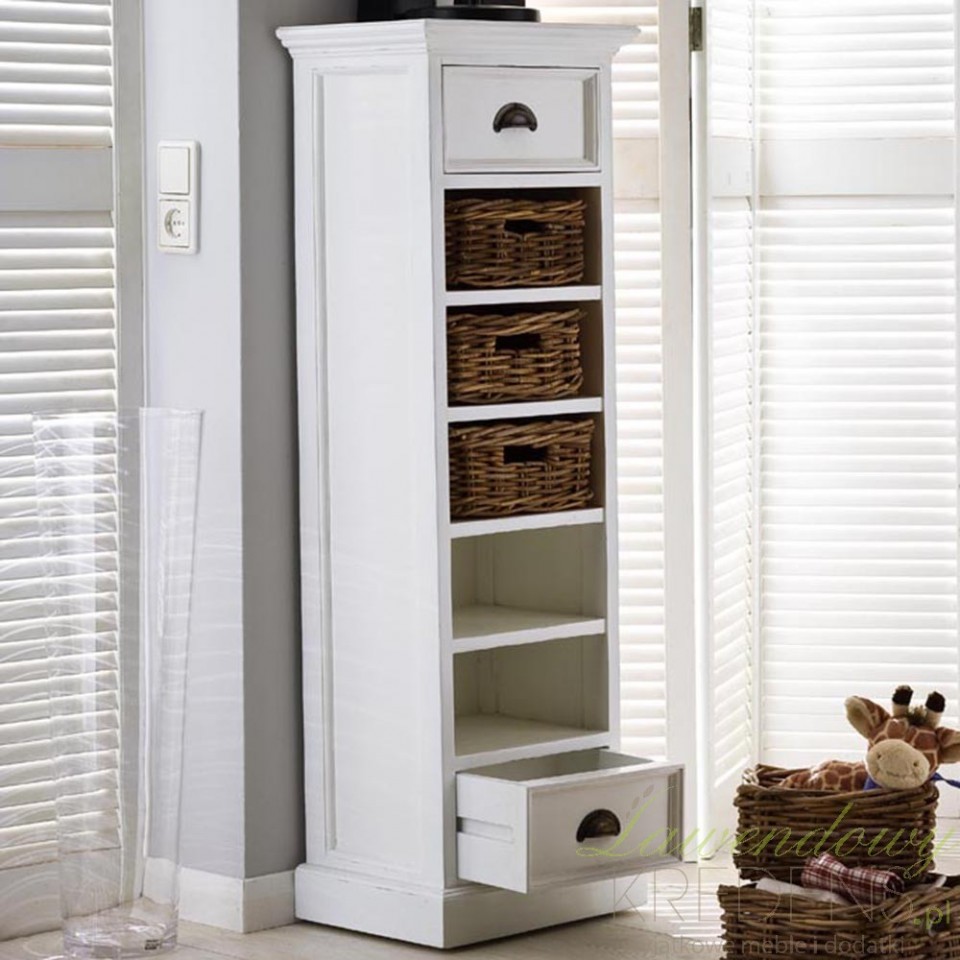Wysoka i zgrabna komoda w stylu prowansalskim to mebel wyposażony w szuflady i rattanowe kosze wypełniające środkowe półki.