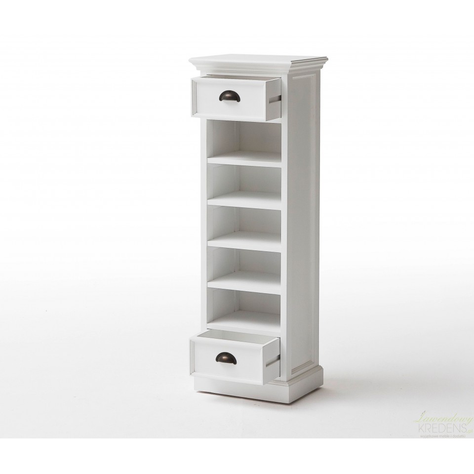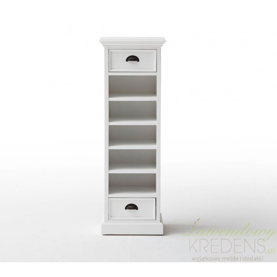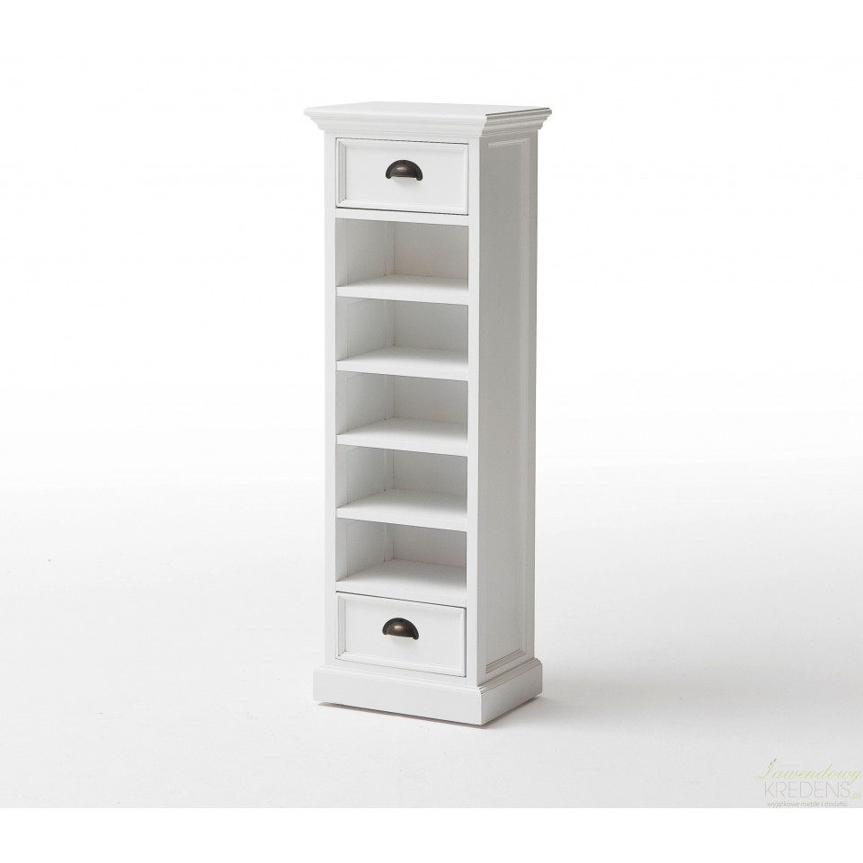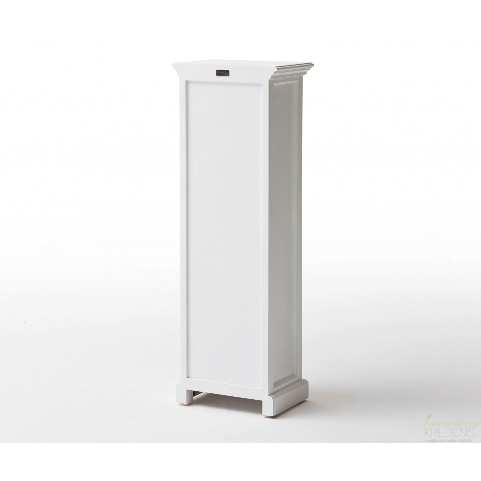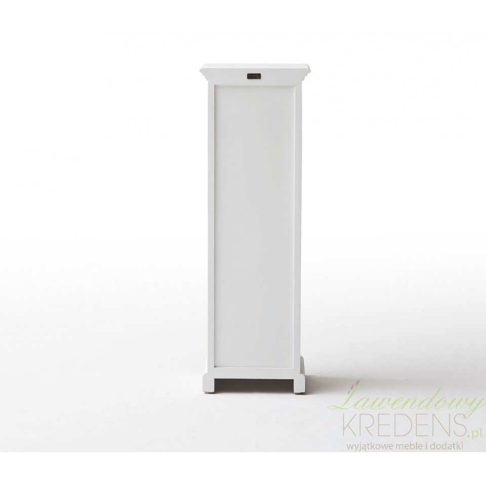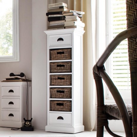 Wysoka i zgrabna komoda w stylu prowansalskim to mebel wyposażony w szuflady i rattanowe kosze wypełniające środkowe półki.