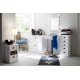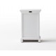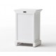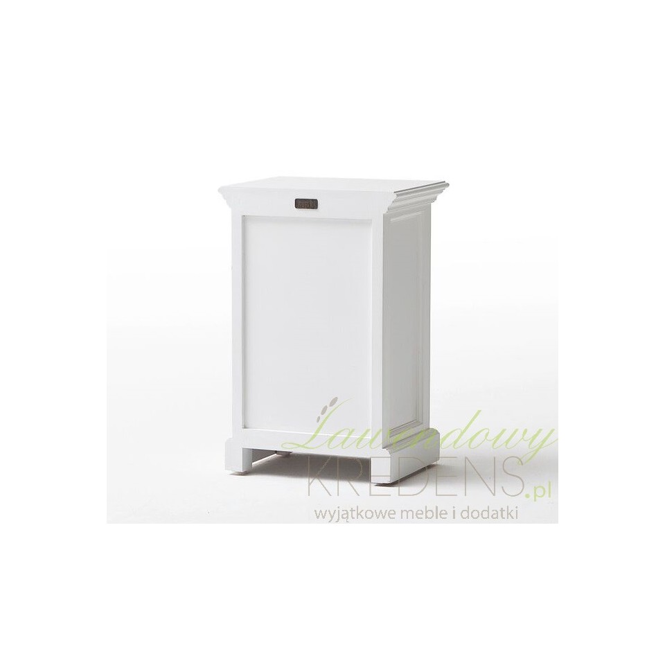 Biała szafka w stylu prowansalskim z koszykiem w kolorze naturalnego brązu, który bezpretensjonalnie ociepla wizerunek mebla.