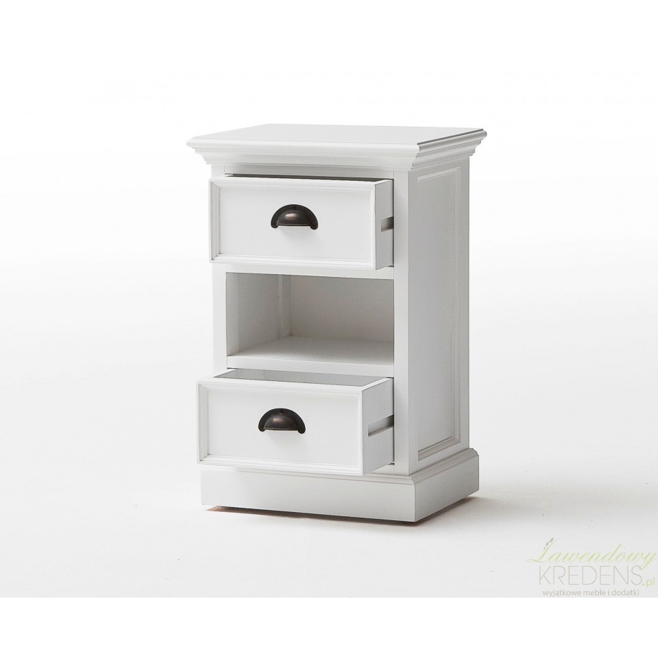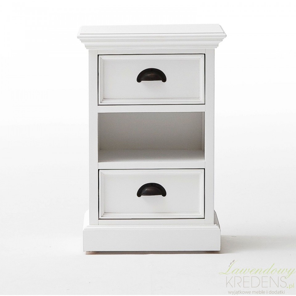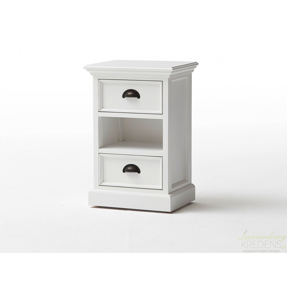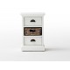 Szafka prowansalska Lumi w całości wykonana została z drewna mahoniowego w kolorze białym o matowej poświacie. Dwa szufladki i niewielki koszyk pomiędzy nimi, powodują że mebel doskonale nadaje się do przechowywania drobiazgów. Szafka w stylu prowansalskim będzie uroczą szafką nocną lub niewielką komódką w przedpokoju. Meble prowansalskie - i mieszkasz pięknie!