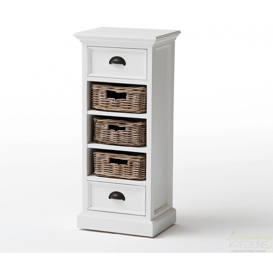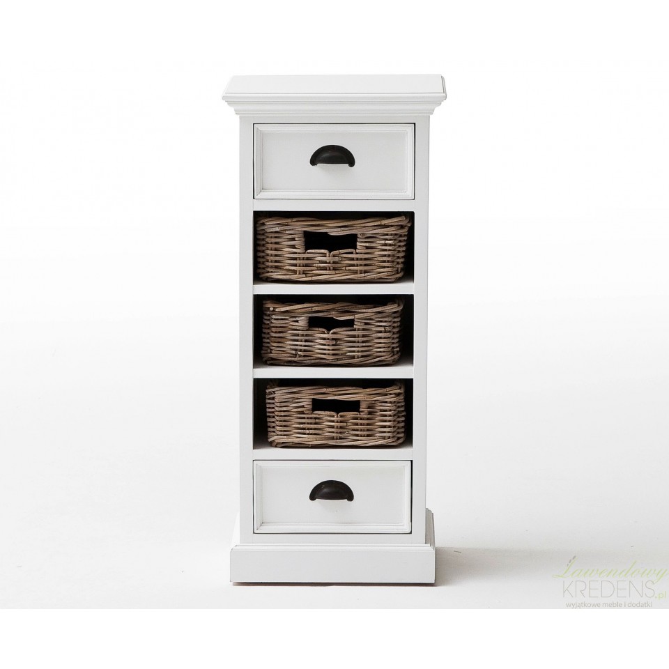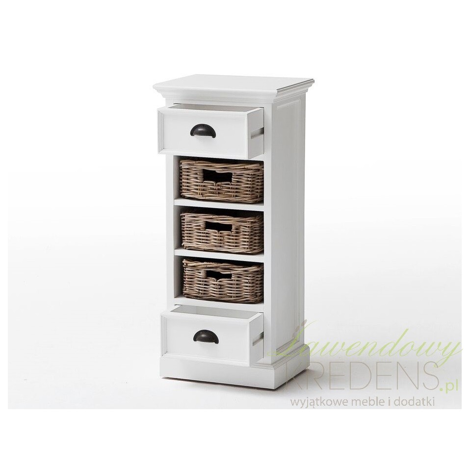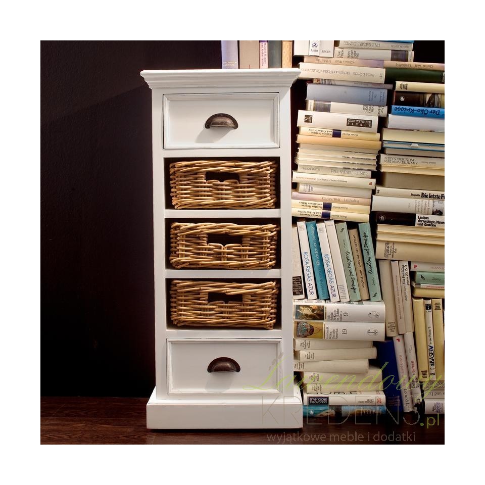 Meble prowansalskie z kolekcji Lumi to przede wszystkim niebanalny styl i ergonomiczna forma. Połączenie mahoniowego drewna i rattanowych koszy sprawdzi się w każdym wnętrzu. Komoda w stylu prowansalskim ma śnieżnobiały kolor, posiada dwie szufladki oraz trzy półki, w których zamiast szuflad znajdują się brązowe koszyki. Komoda prowansalska o naturalnym wyglądzie to mebel najczęściej wybierany do salonów.