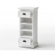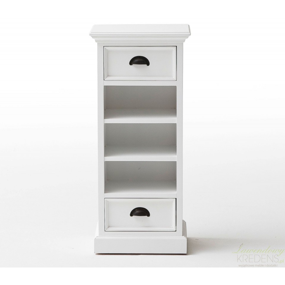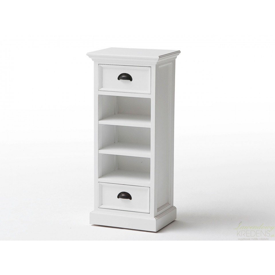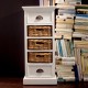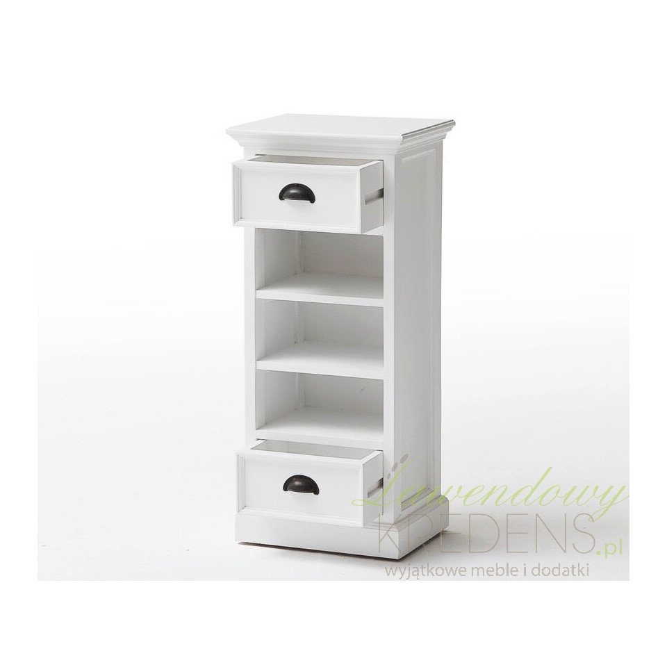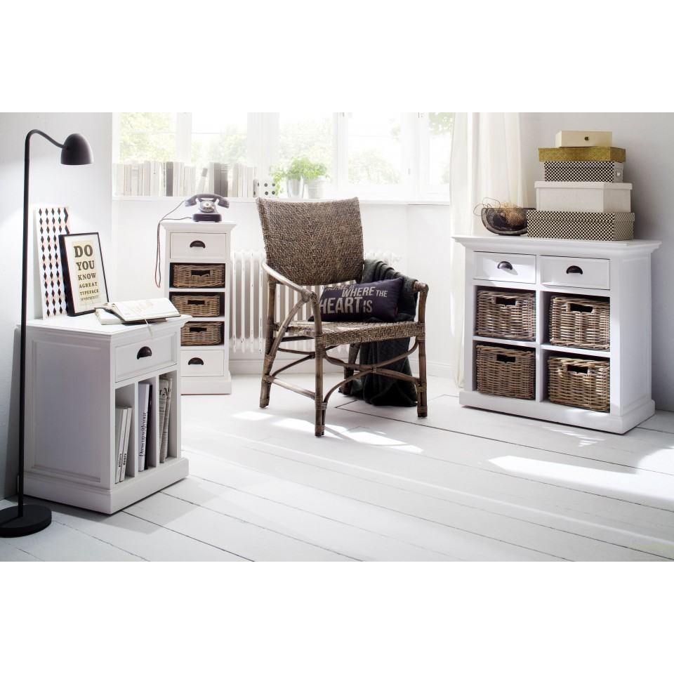 Meble prowansalskie z kolekcji Lumi to przede wszystkim niebanalny styl i ergonomiczna forma. Połączenie mahoniowego drewna i rattanowych koszy sprawdzi się w każdym wnętrzu. Komoda w stylu prowansalskim ma śnieżnobiały kolor, posiada dwie szufladki oraz trzy półki, w których zamiast szuflad znajdują się brązowe koszyki. Komoda prowansalska o naturalnym wyglądzie to mebel najczęściej wybierany do salonów.