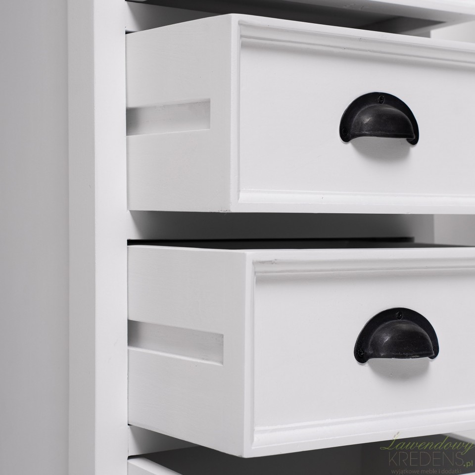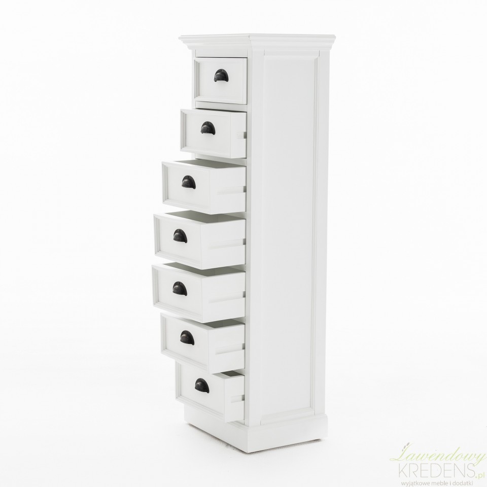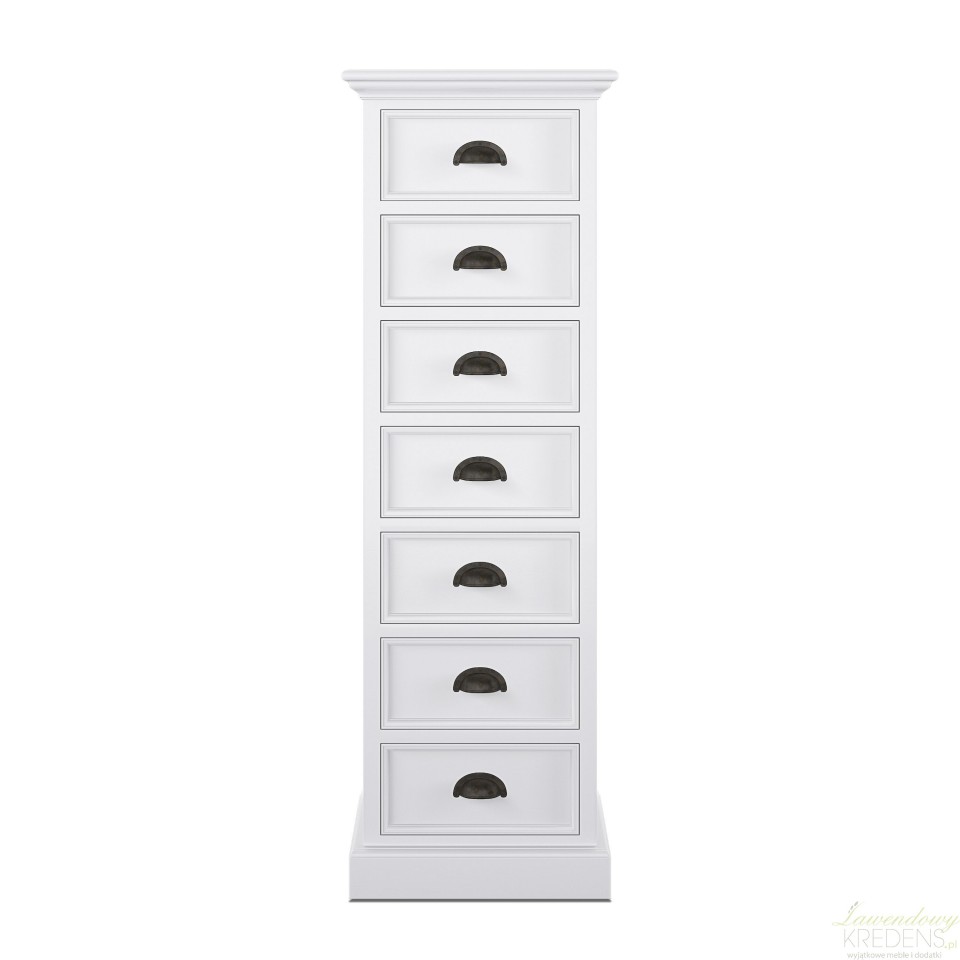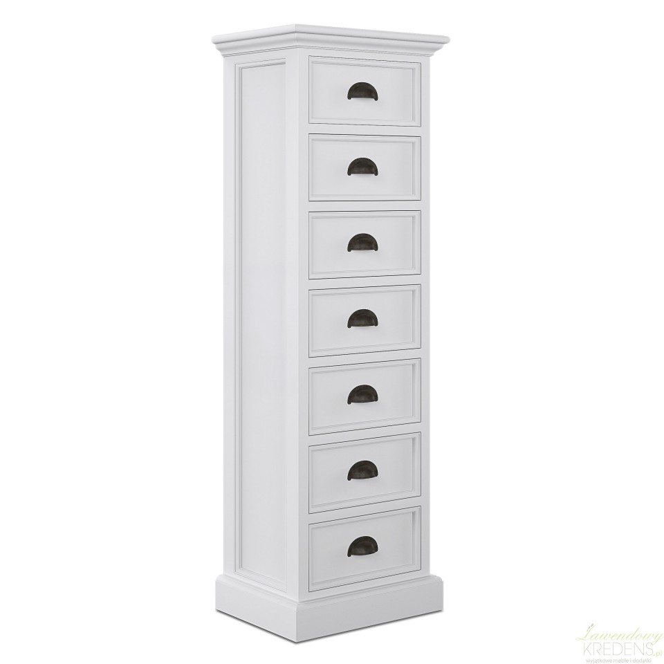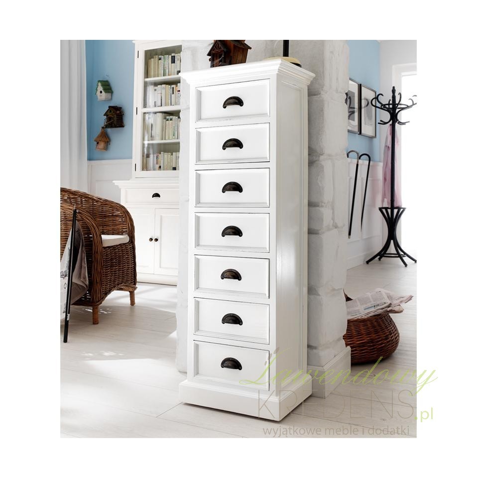 Wąska komoda w stylu prowansalskim to produkt, który został wykonany z drewna mahoniowego. Korpus mebla wykończono białym lakierem, który sprawia, że jego powierzchnia jest aksamitnie matowa. Połączenie bieli i praktycznej komody w stylu prowansalskim okażą się świetnym wyborem dla każdego kto, pragnie dodać nowoczesnym przestrzeniom nutki naturalności i lekkości. Na wąską komodę składa się siedem szufladek wyposażonych w zaokrąglone uchwyty metalowe.