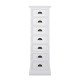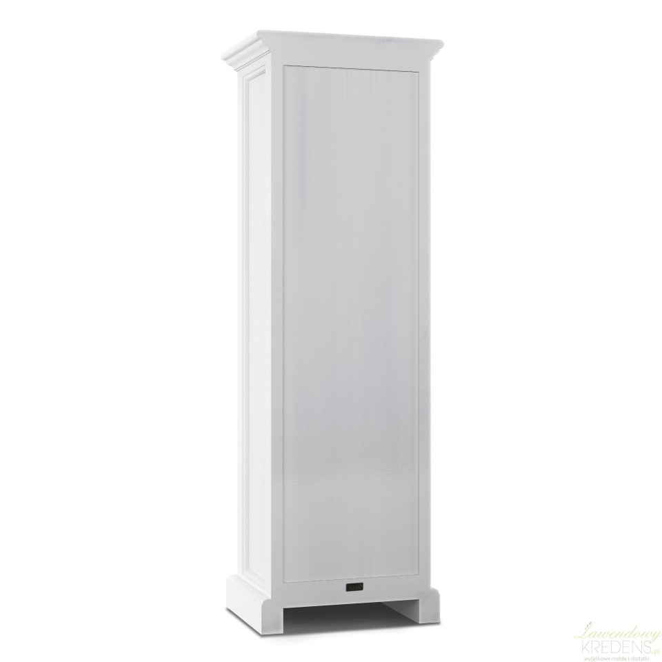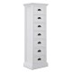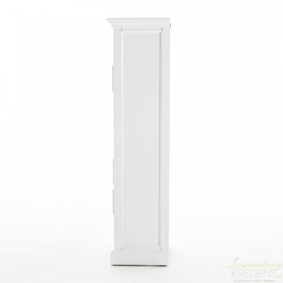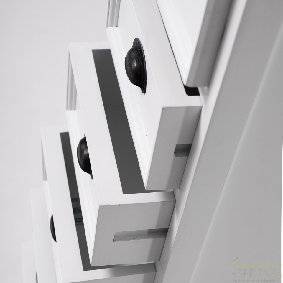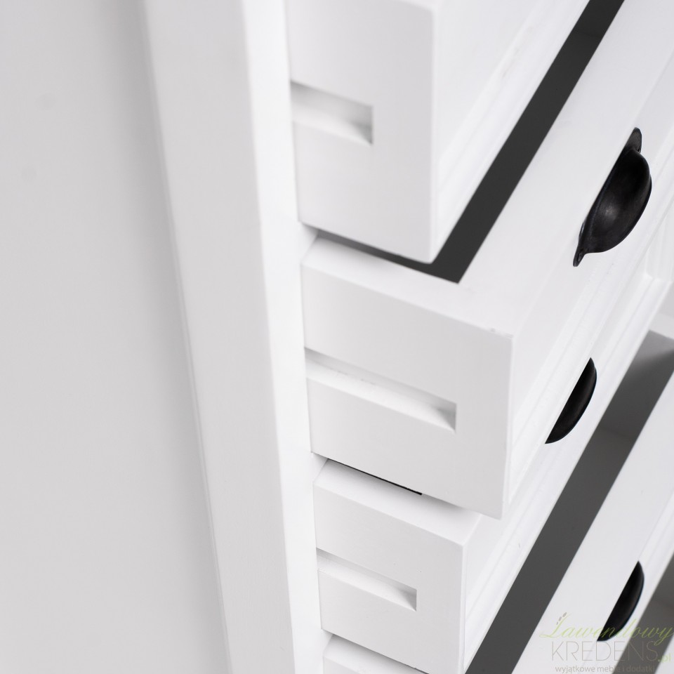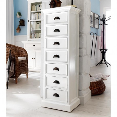 Wąska komoda w stylu prowansalskim to produkt, który został wykonany z drewna mahoniowego. Korpus mebla wykończono białym lakierem, który sprawia, że jego powierzchnia jest aksamitnie matowa. Połączenie bieli i praktycznej komody w stylu prowansalskim okażą się świetnym wyborem dla każdego kto, pragnie dodać nowoczesnym przestrzeniom nutki naturalności i lekkości. Na wąską komodę składa się siedem szufladek wyposażonych w zaokrąglone uchwyty metalowe.