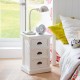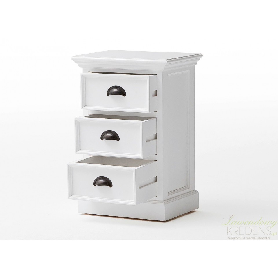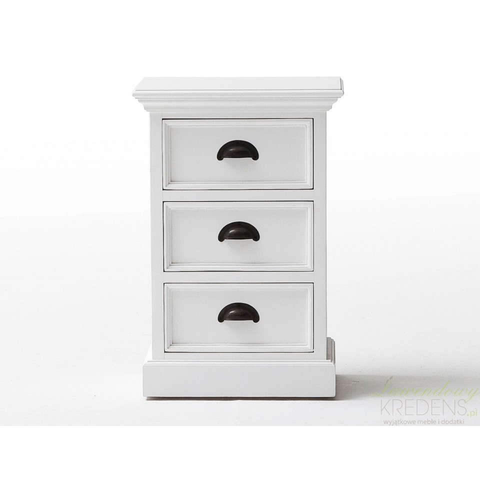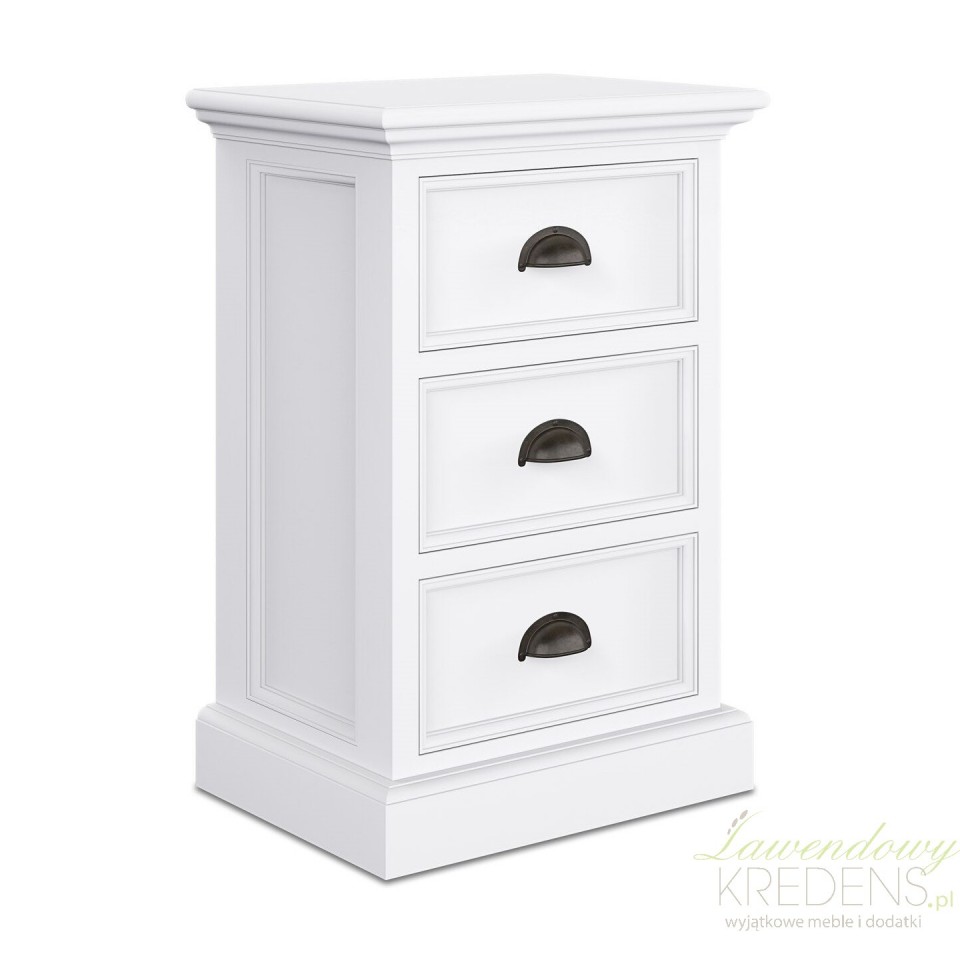 Szafka w stylu prowansalskim ma trzy pojemne szufladki i prostokątny blat, które ułatwiają gospodarowanie bibelotami w salonie, w przedpokoju i w sypialni.