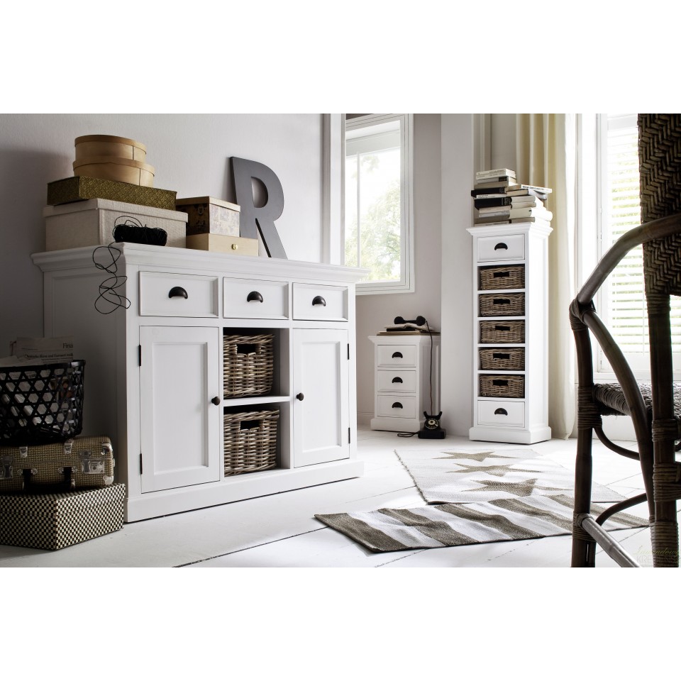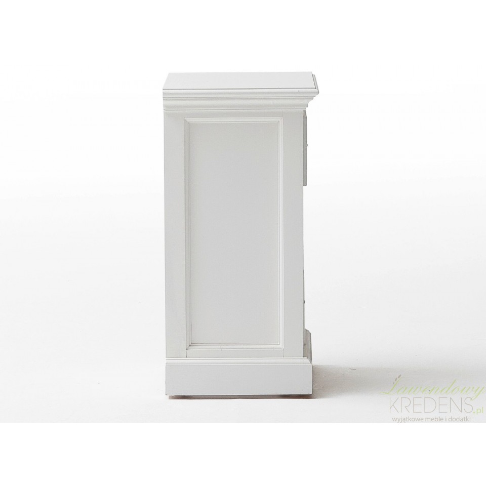 Elegancka szafka prowansalska to mebel, który polubią wszyscy, którzy próbują uporać się masą drobiazgów w użytkowym wnętrzu. Ten drewniany mebel w białym kolorze pochodzi z serii mebli Lumi, pośród których czekają na Ciebie także inne meble prowansalskie. Dzięki nim urządzisz jasny i piękny salon lub sypialnię. Prosta budowa, matowa powierzchnia i półokrągłe uchwyty metalowe w czarnym kolorze sprawiły, że szafka w stylu prowansalskim cieszy się popularnością w wnętrzach, którym nie brakuje klasy.