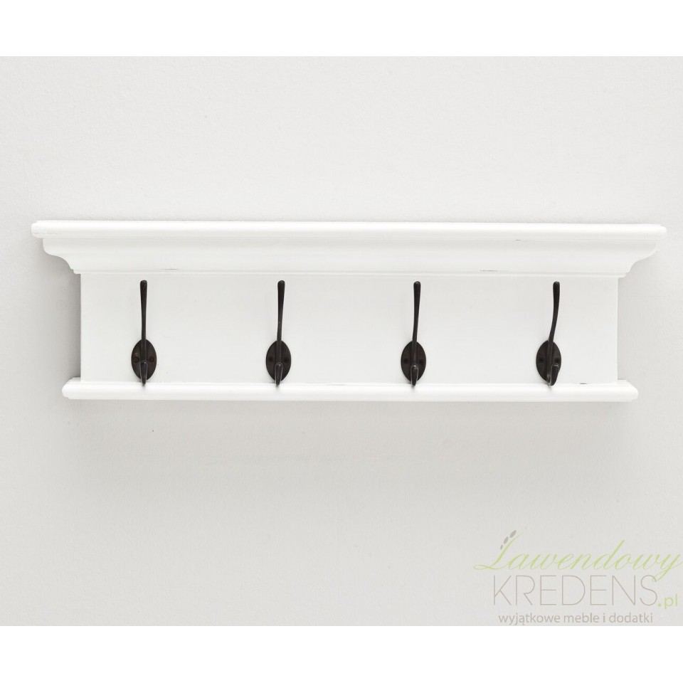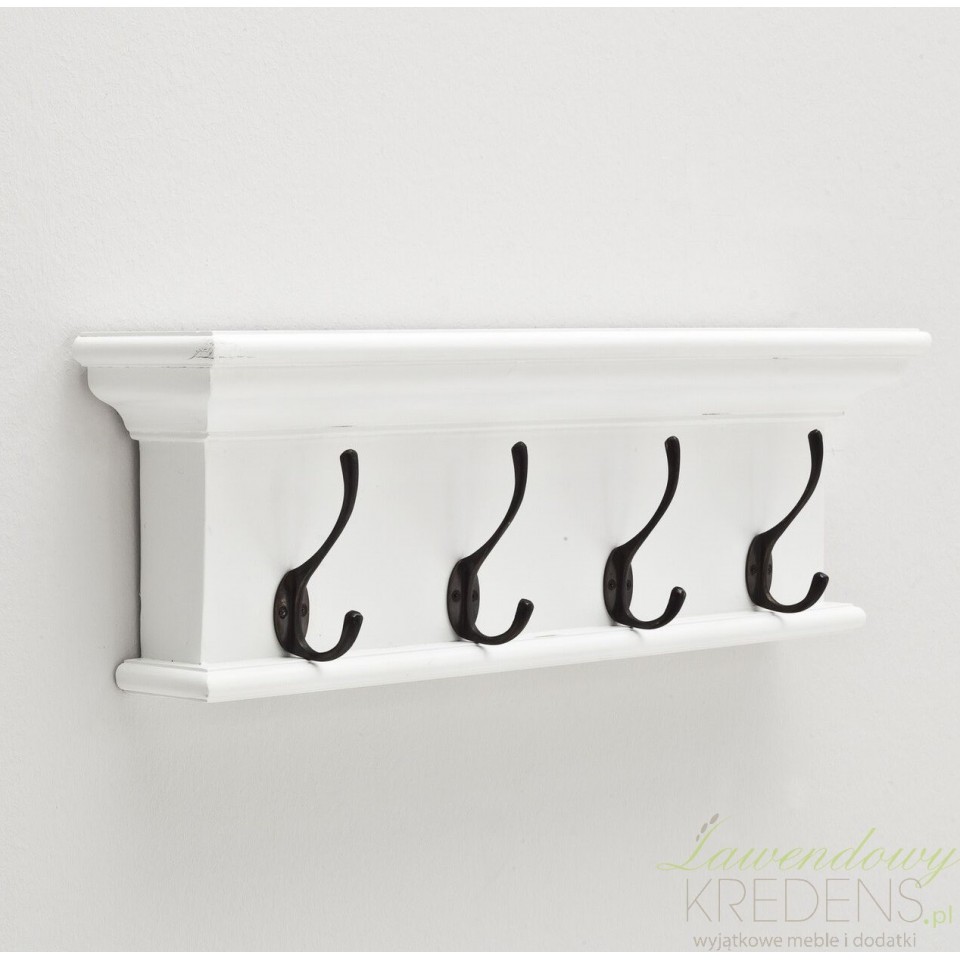 Długi na siedemdziesiąt centymetrów wieszak ścienny stylizowany na styl prowansalski w kształcie zbliżonym do prostokąta. Wieszak wyposażony jest w cztery, podwójne haczyki.