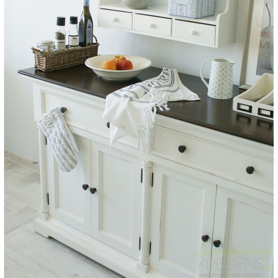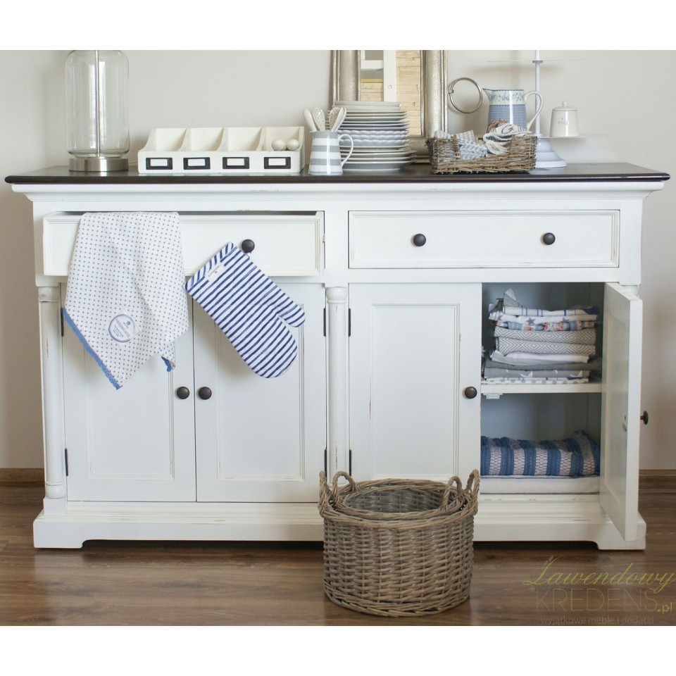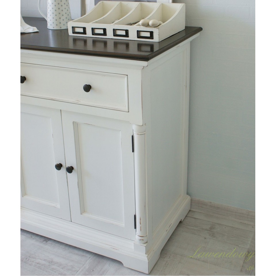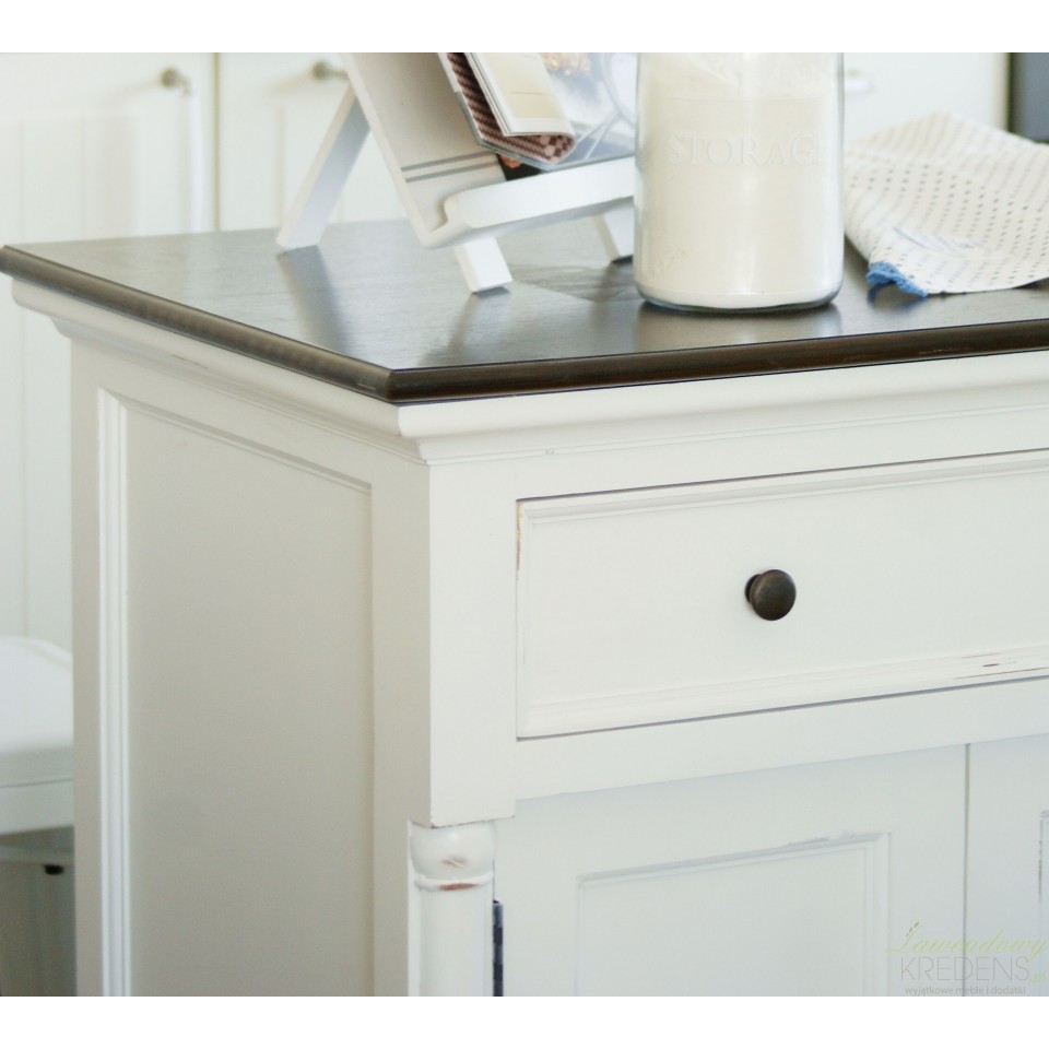 Biała komoda w stylu prowansalskim to klasyczny mebel z brązowym blatem oraz dwiema szufladami i szafkami.