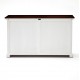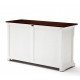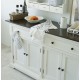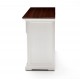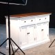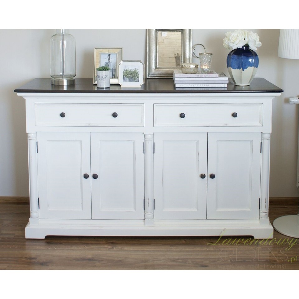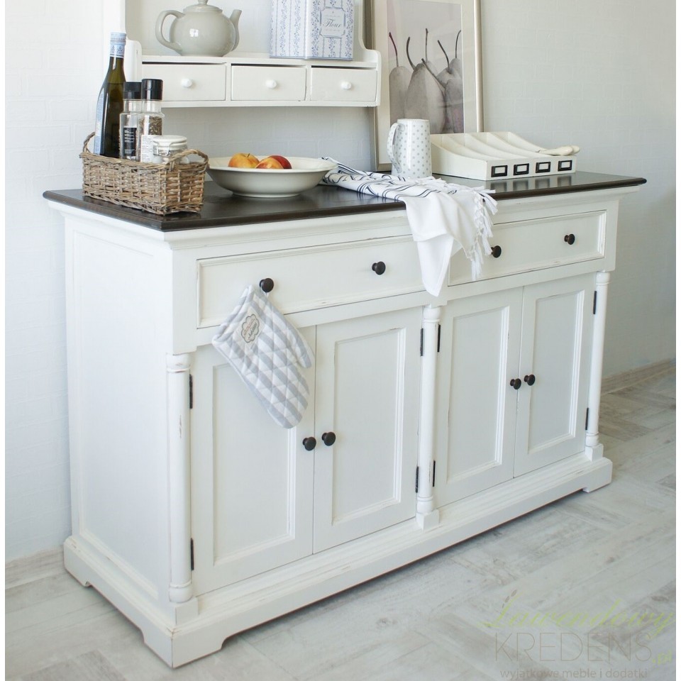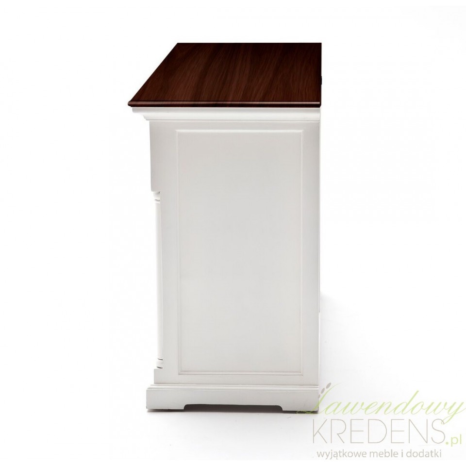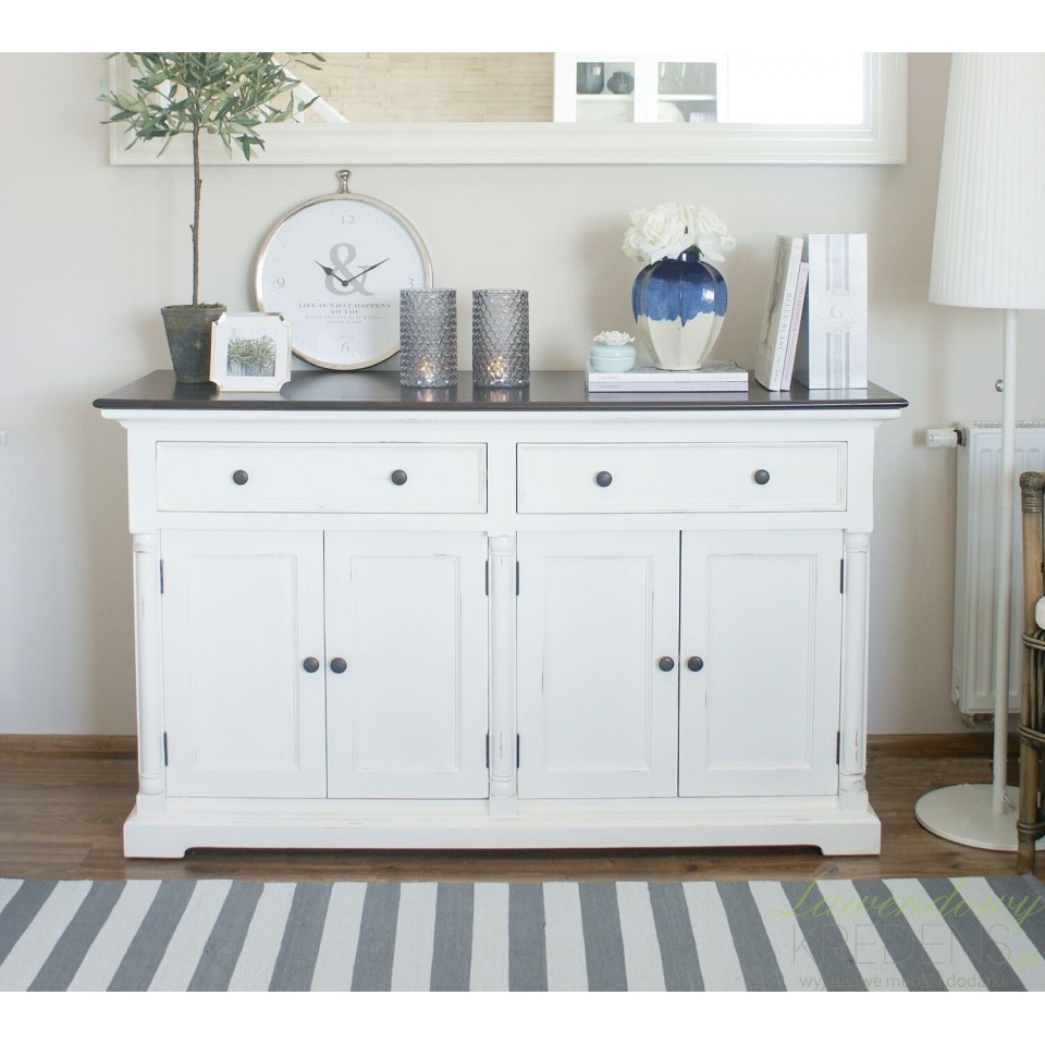 Biała komoda w stylu prowansalskim to klasyczny mebel z brązowym blatem oraz dwiema szufladami i szafkami.