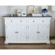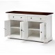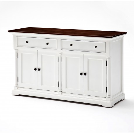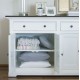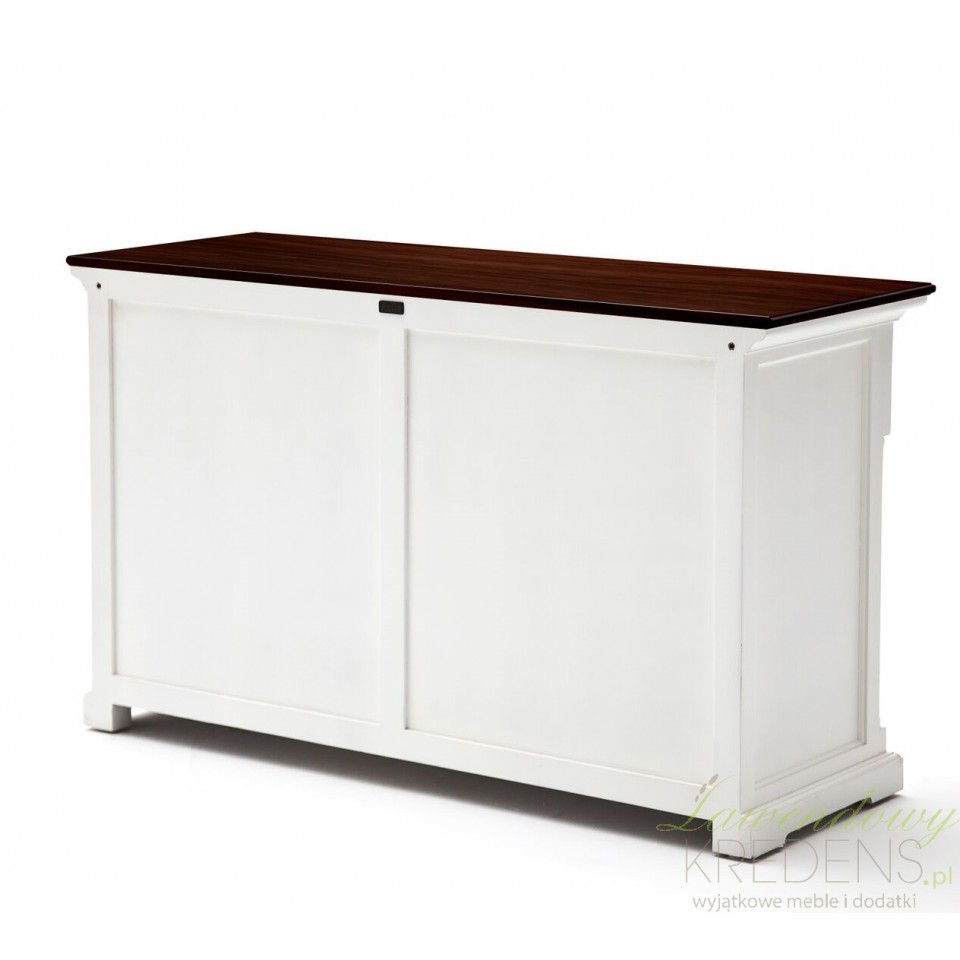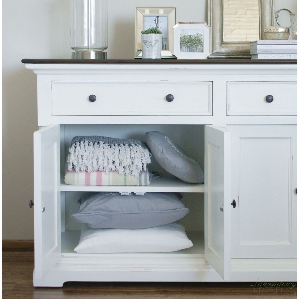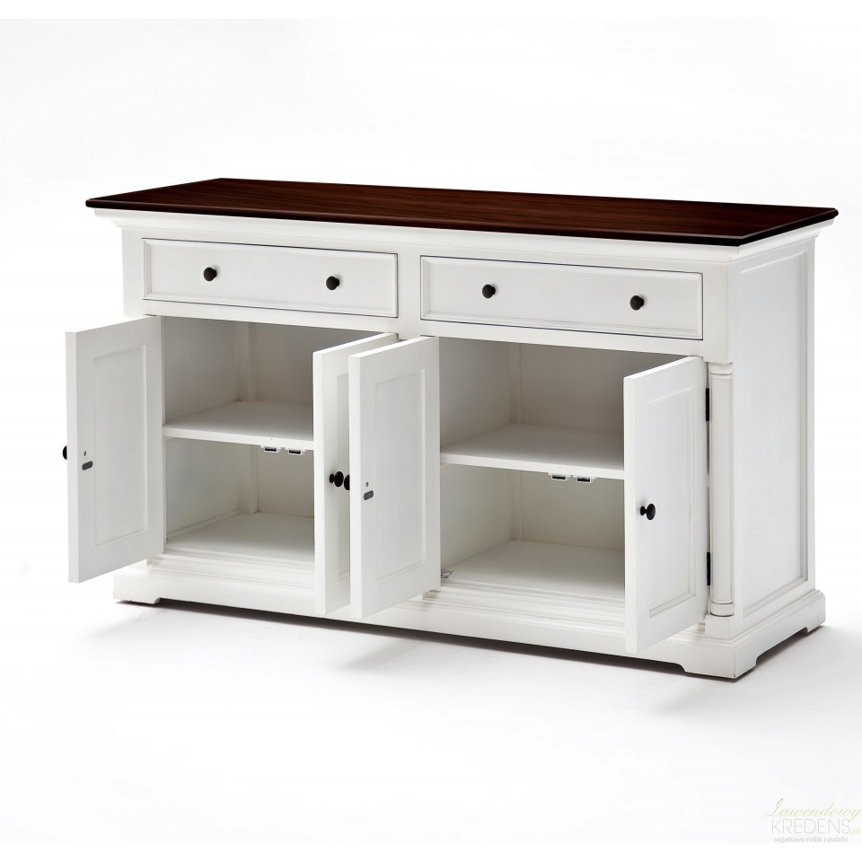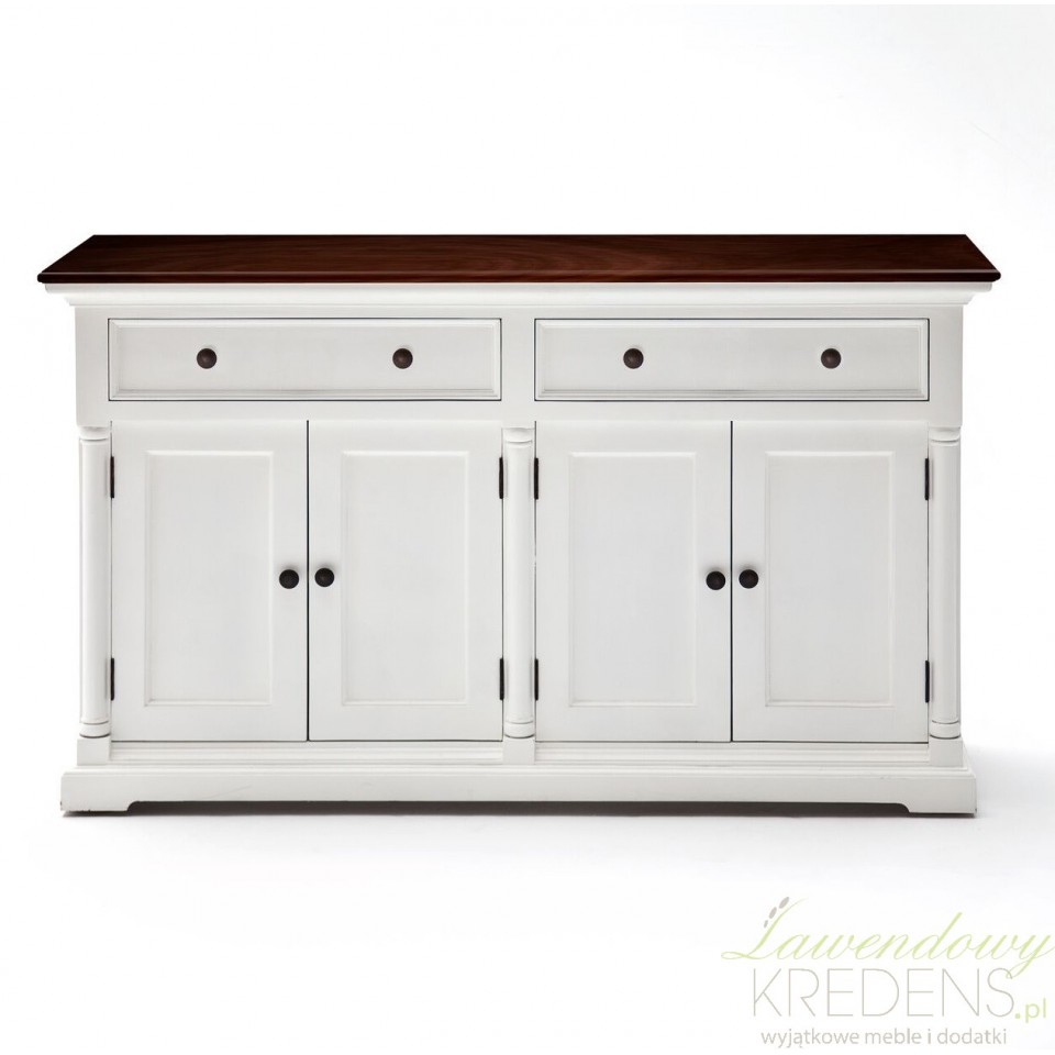 Biała komoda prowansalska, której szerokość sięga blisko półtorametra to wyjątkowy mebel do przechowywania. W dolnej części mebla znajdują się dwie pojemne szafki, obie zamykane podwójnymi skrzydłami. Pod brązowym blatem umieszczono dwie wysuwane szuflady. Drewniane meble prowansalskie z kolekcji Lumi to najlpeszy wybór dla Twojego domu!