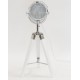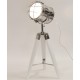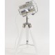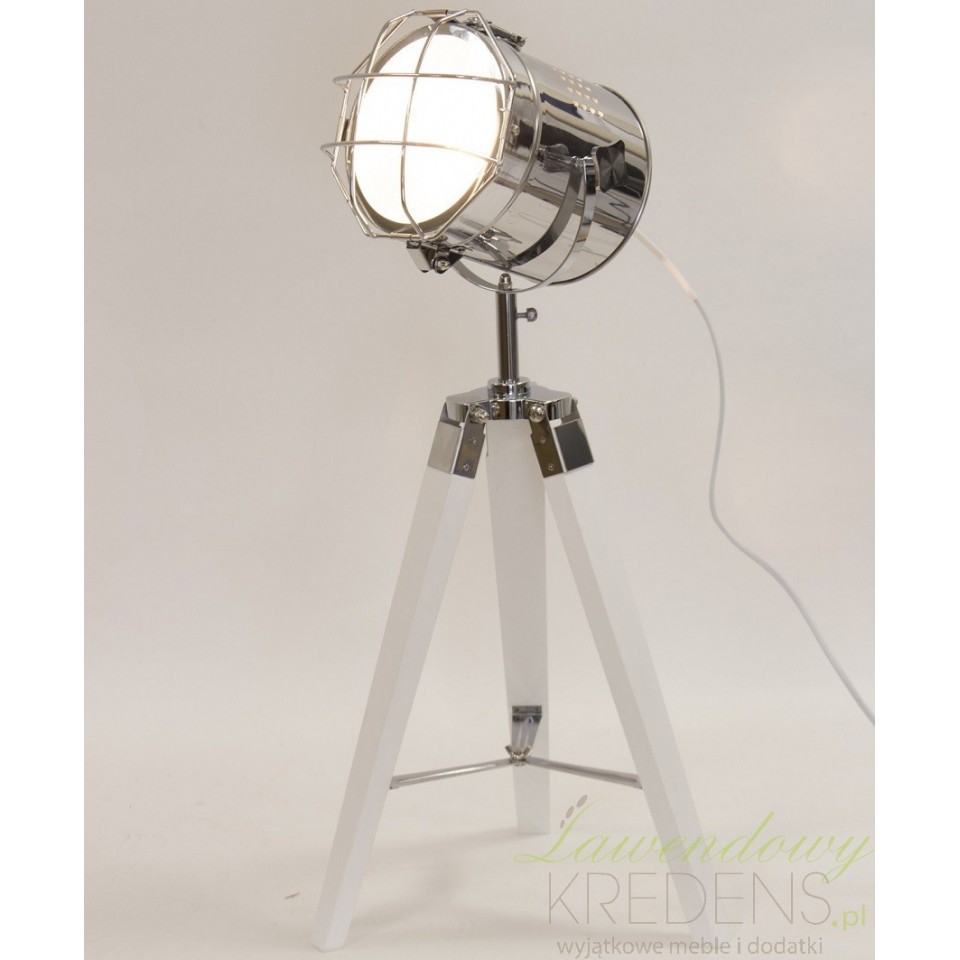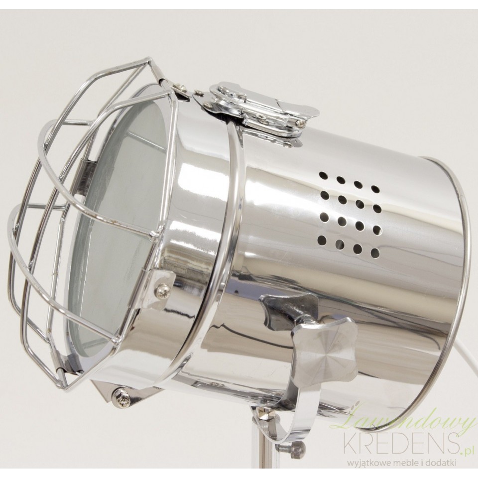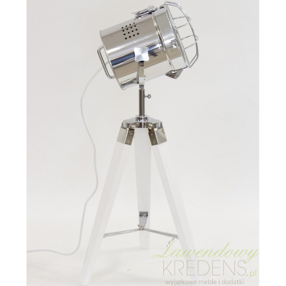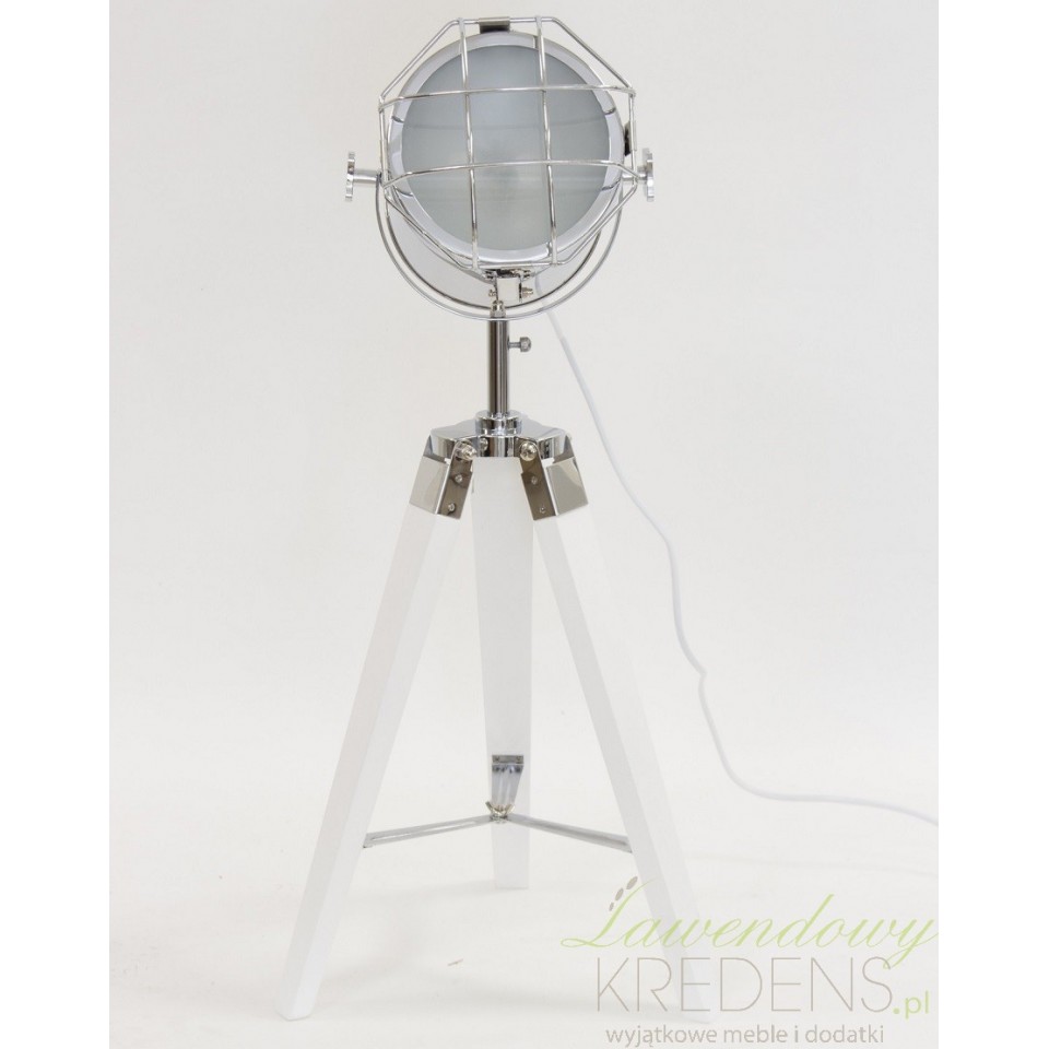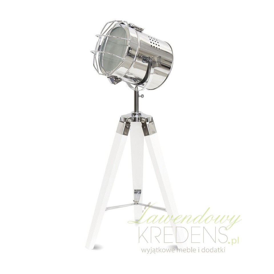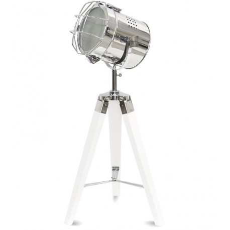 Stojąca lampa reflektor na białych nogach z srebrnym kloszem. Nogi są lakierowane na biało, a abażur w kształcie reflektora w efektowny sposób dopełniają wkręty i śruby. Genialnie prezentować będzie się na stoliku nocnym w skandynawskiej sypialni lub na komodzie w industrialnym salonie. Jej chłodny charakter równoważyć będzie przyjemne światło wydobywające się z ukrytej za metalową kratką żarówki.