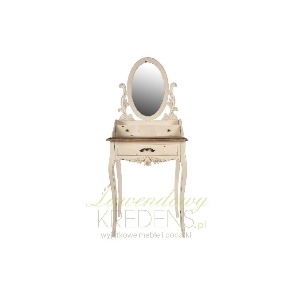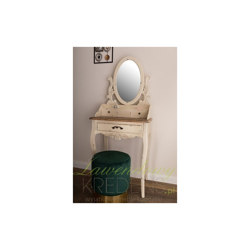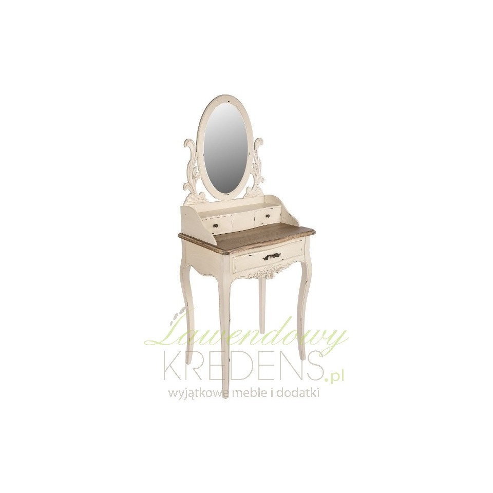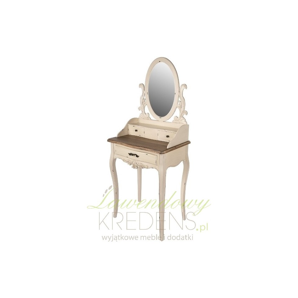 Zjawiskowa toaletka prowansalska podkreśli klimatyczny wystrój kobiecego pokoju. Półki i szuflady, w które ją wyposażono nie odbierają uroku efektownemu lusterku w dekoracyjnej ramie. Postarzana toaletka z brązowym blatem i subtelnie wygiętymi nogami ma wszystko co powinien mieć funkcjonalny mebel. Toaletka prowansalska będzie genialnie wyglądała w połączeniu z wygodnym fotelem wilinowym lub tapicerowanym krzesłem.