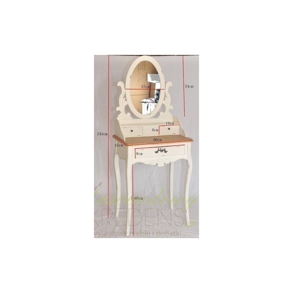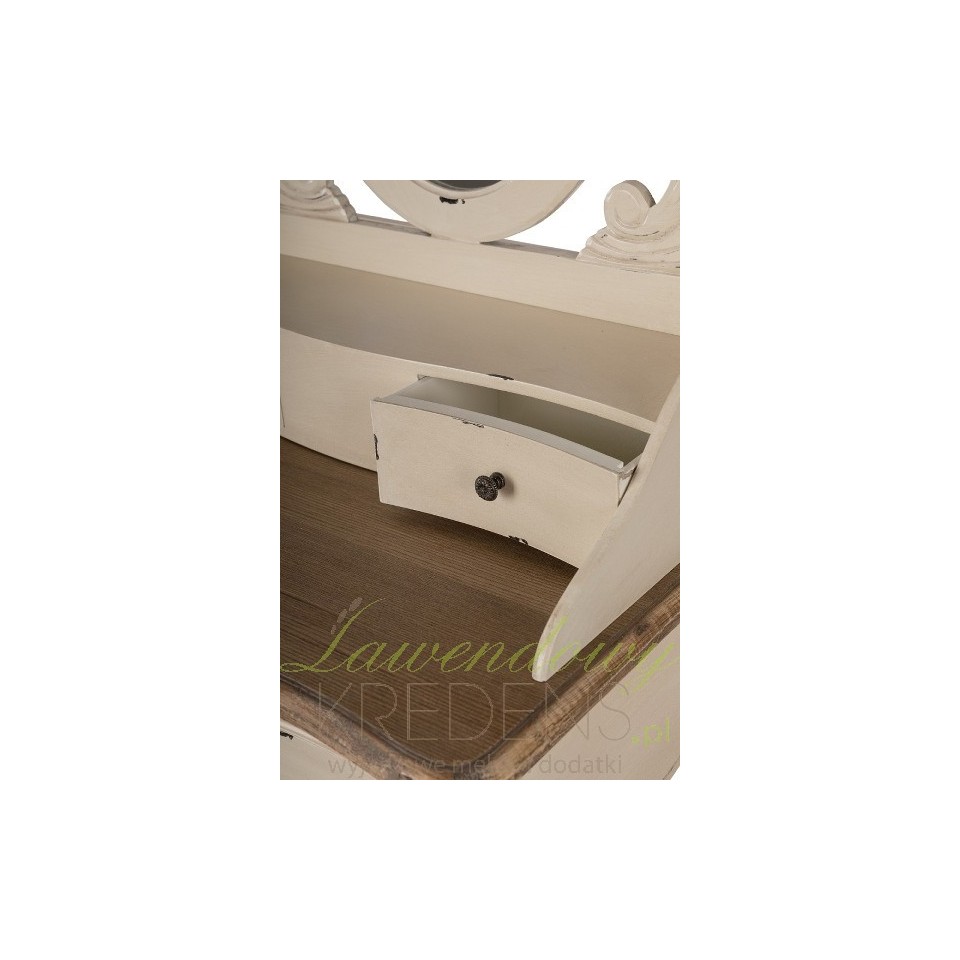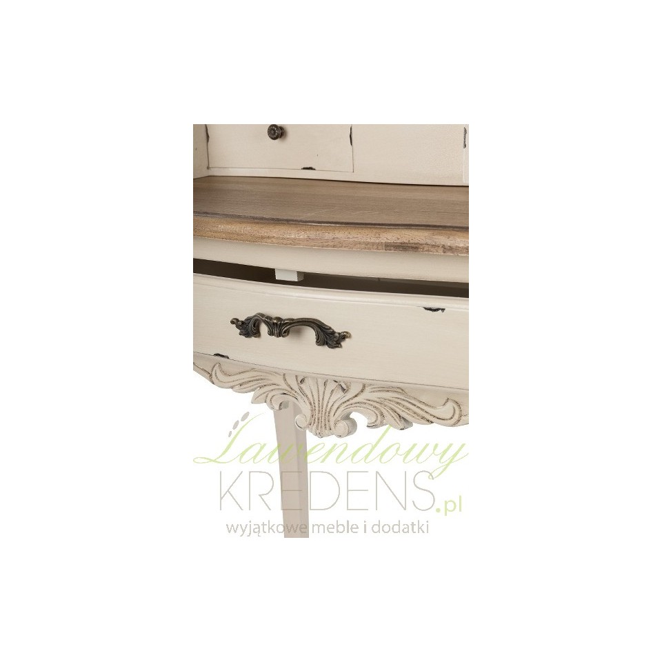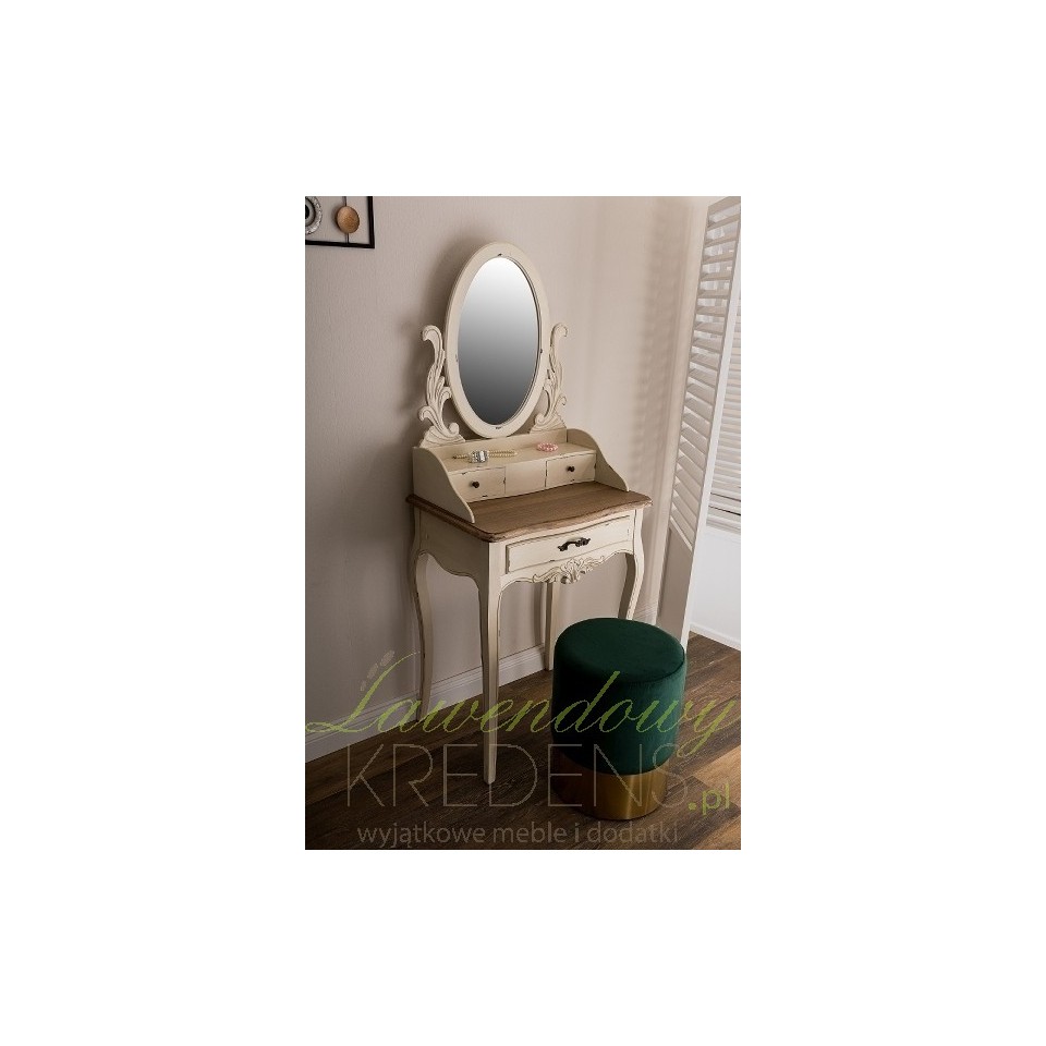 Zjawiskowa toaletka prowansalska podkreśli klimatyczny wystrój kobiecego pokoju. Półki i szuflady, w które ją wyposażono nie odbierają uroku efektownemu lusterku w dekoracyjnej ramie. Postarzana toaletka z brązowym blatem i subtelnie wygiętymi nogami ma wszystko co powinien mieć funkcjonalny mebel. Toaletka prowansalska będzie genialnie wyglądała w połączeniu z wygodnym fotelem wilinowym lub tapicerowanym krzesłem.