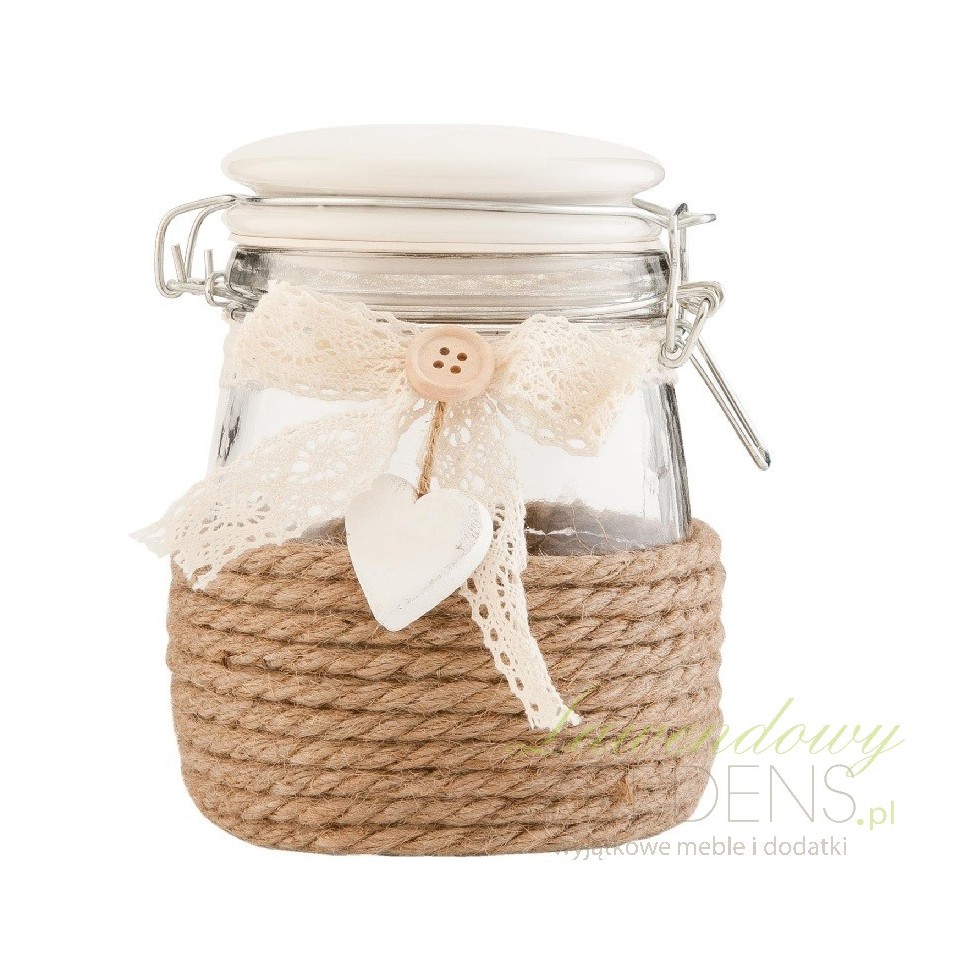 Szklane słoiki kuchenne oplecione do połowy brązowym sznurkiem posiadają szczelne przykrywki. To najlepsze połączenie funkcjonalności z dekoracyjnością jakie mamy Ci do zaoferowania. Pojemniki kuchenne w stylu prowansalskim z jasnymi przykrywkami i uroczymi kokardami z koronki robią wrażenie. Takie dodatki do kuchni każdy chciałby mieć w swoim domu!