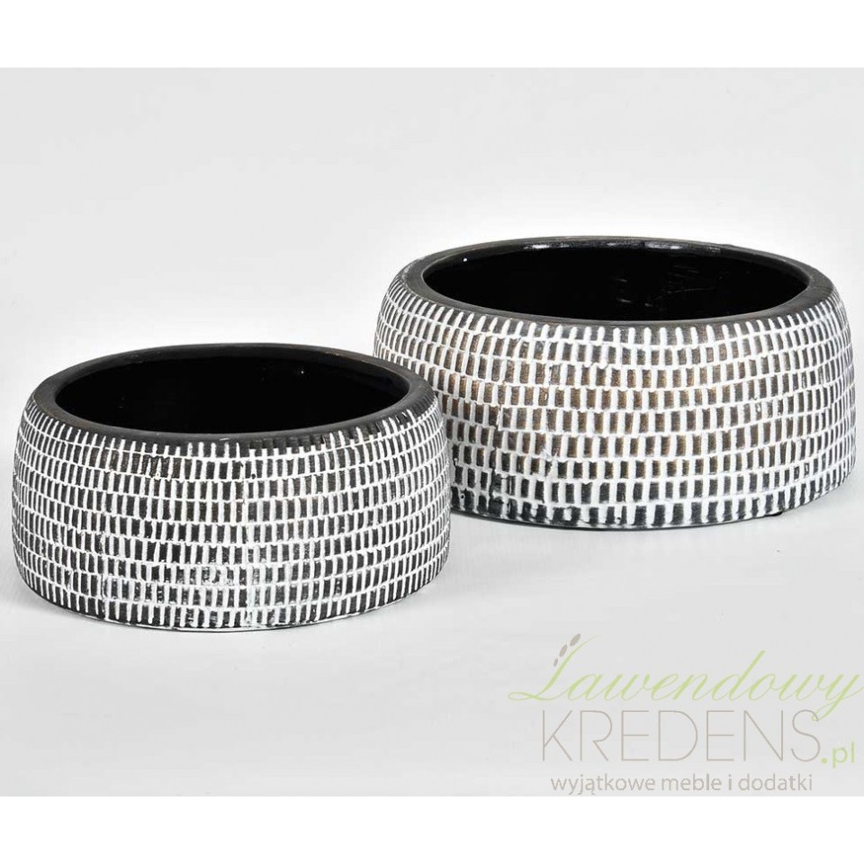 Osłonka Belldeco jest niska, okrągła i ciekawie ozdobiona bielonym wzorem wyżłobionym na czarnej, gładkiej powierzchni.