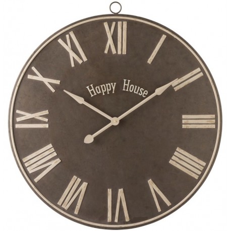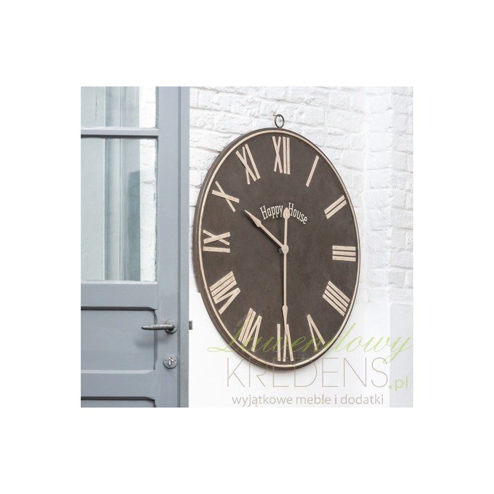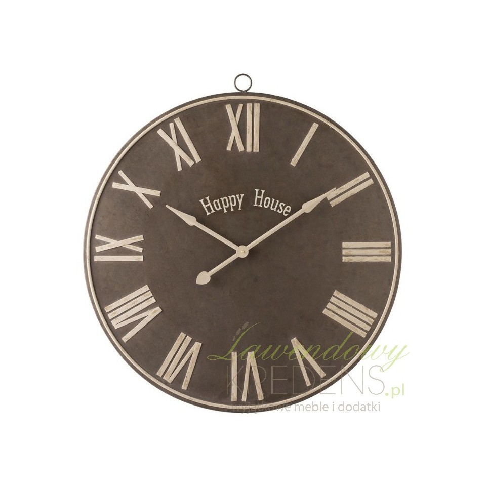 Postaw na dekoracyjne akcenty w postaci funkcjonalnych dodatków! Ten metalowy zegar ścienny to idealny pomysł na ponadczasową ozdobę do każdego wnętrza. Jego cyfry umieszczone są na dużej, okrągłej tarczy w kolorze brązowym, dzięki czemu są wyraziste i ułatwią odczytanie godziny. Funkcję dekoracyjną pełnią angielskie napisy "Happy House" pośrodku tarczy.