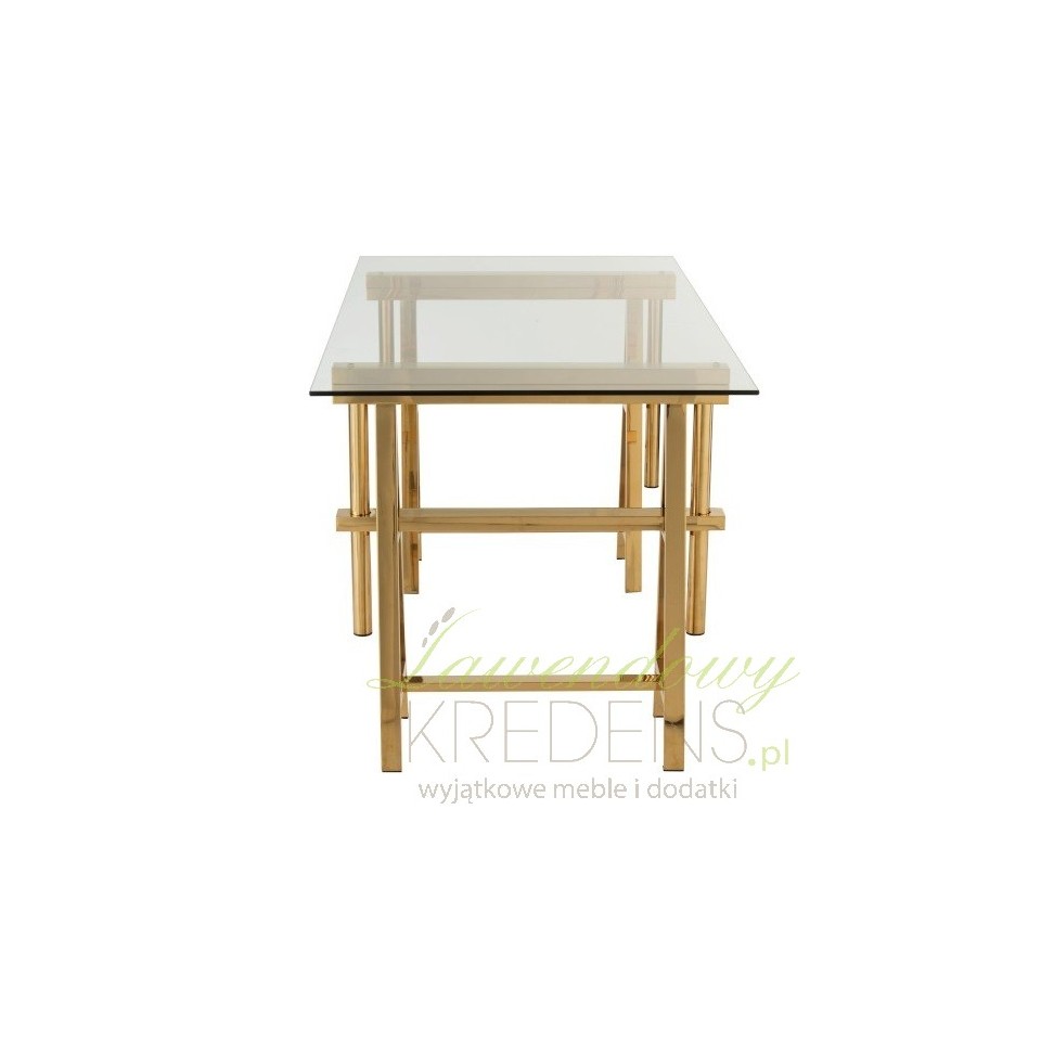 Duży stół jadalniany lub luksusowy stół konferencyjny to współczesny mebel z oferty producenta Home Decoration. Stół składa się z dwóch stabilnych nóg w kolorze złotym, które posiadają mechanizm do regulowania wysokości mebla. Złote nogi zestawione ze szklanym blatem wyglądają spektakularnie pięknie, podobnie jak inne meble loftowe z tej samej linii. Dzięki połączeniu minimalistycznej formy ze złotym akcentem otrzymujesz złoty stół nie bylejakiej jakości!