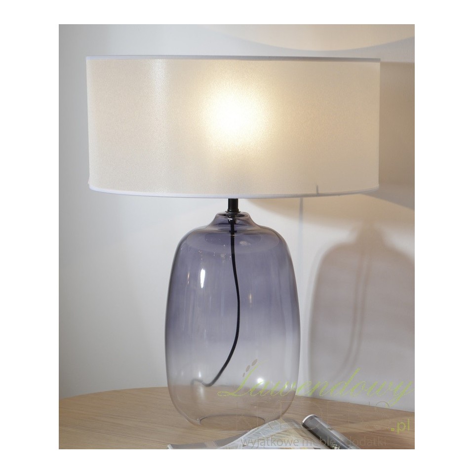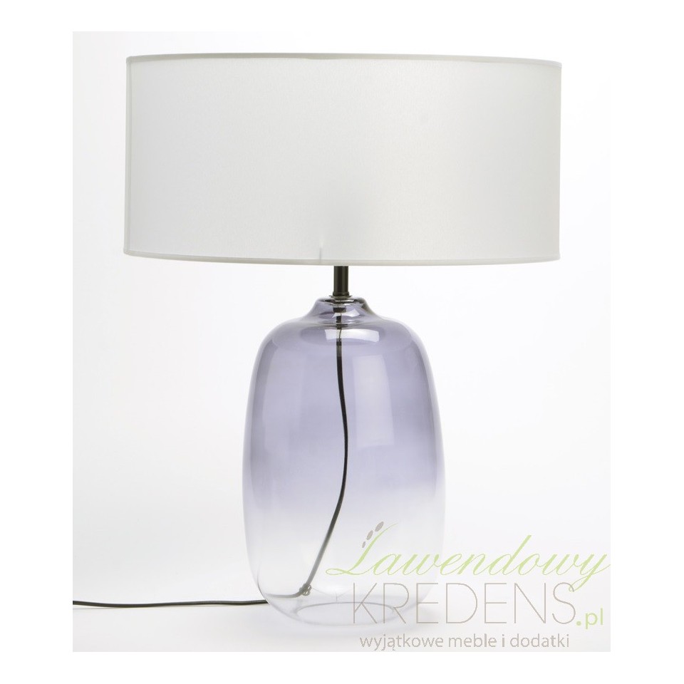 Przezroczysta lampa stołowa została stworzona po to aby się wyróżniać. Uwagę niewątpliwie przykuwa noga lampy wykonana z dmuchanego szkła, zabarwiona na fioletowo. Lampa posiada duży klosz o średnicy ponad 60 centymetrów! Świetna w wersji lampki nocnej lub lampki biurkowej.