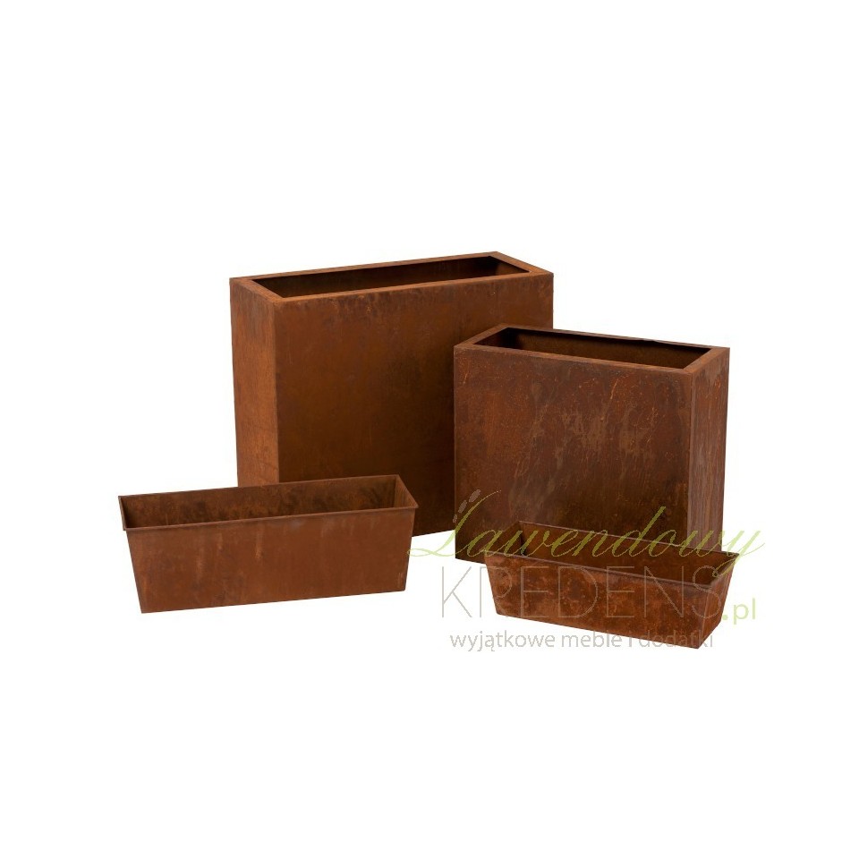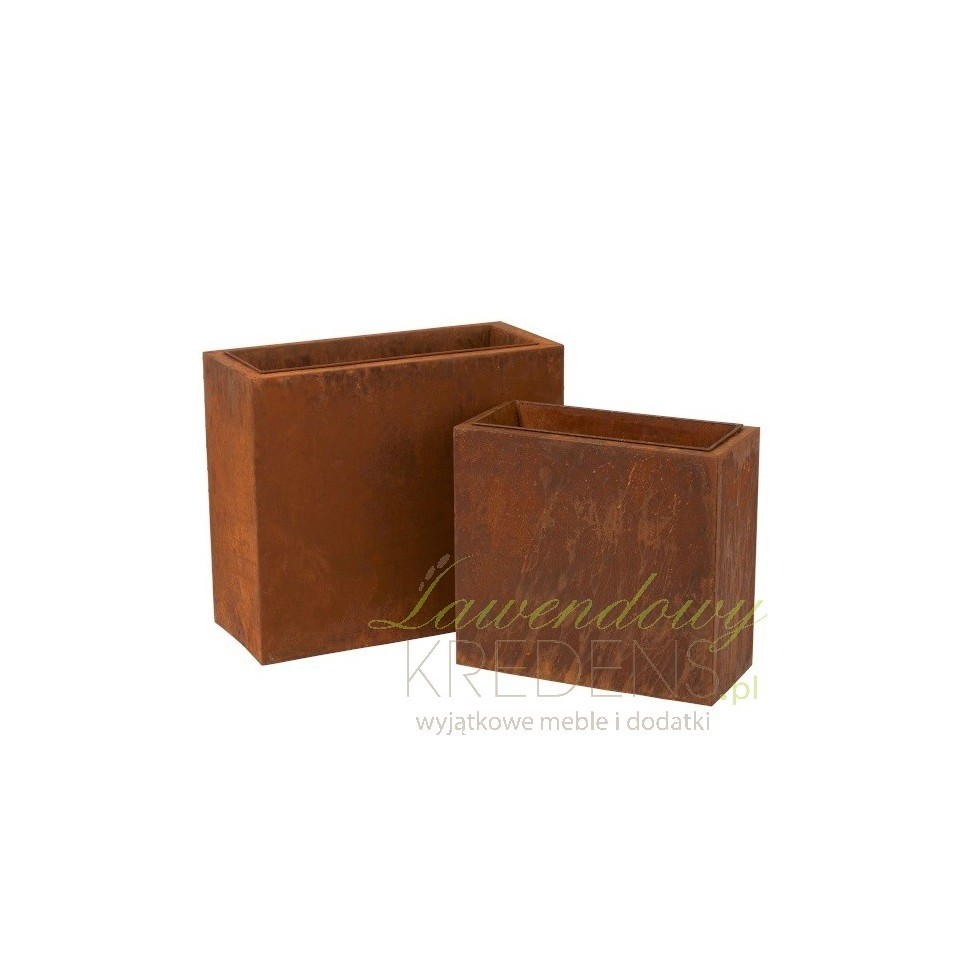 Dwie metalowe i wysokie doniczki pozwolą Ci urządzić wyjątkowy ogród. Obie donice mają kształt prostokątów i za sprawą odpowiednio dobranej kolorystyki i faktury wyglądają jakby zardzewiały ze starości. To jednak złudzenie, ponieważ donice są nowe i jesteśmy pewni, że zagoszczą w Twoim domu lub w ogrodzie na długie lata! Zamów rdzawe doniczki już teraz!