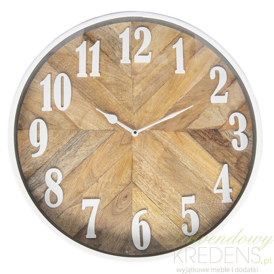 Oryginalny zegar to modne połączenie bieli z brązową, naturalnie prezentującą się tarczą wykonaną z drewna. Musisz go mieć w swoim salonie!