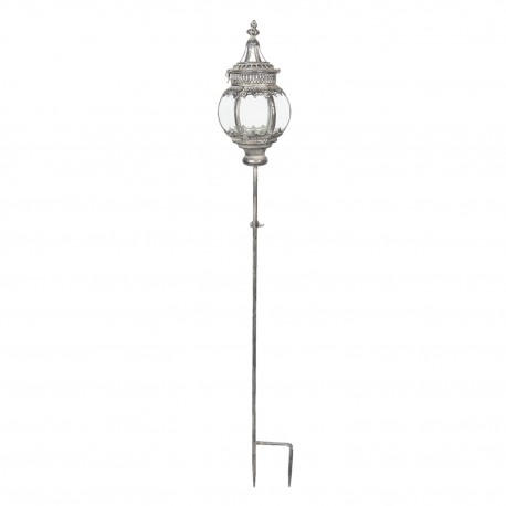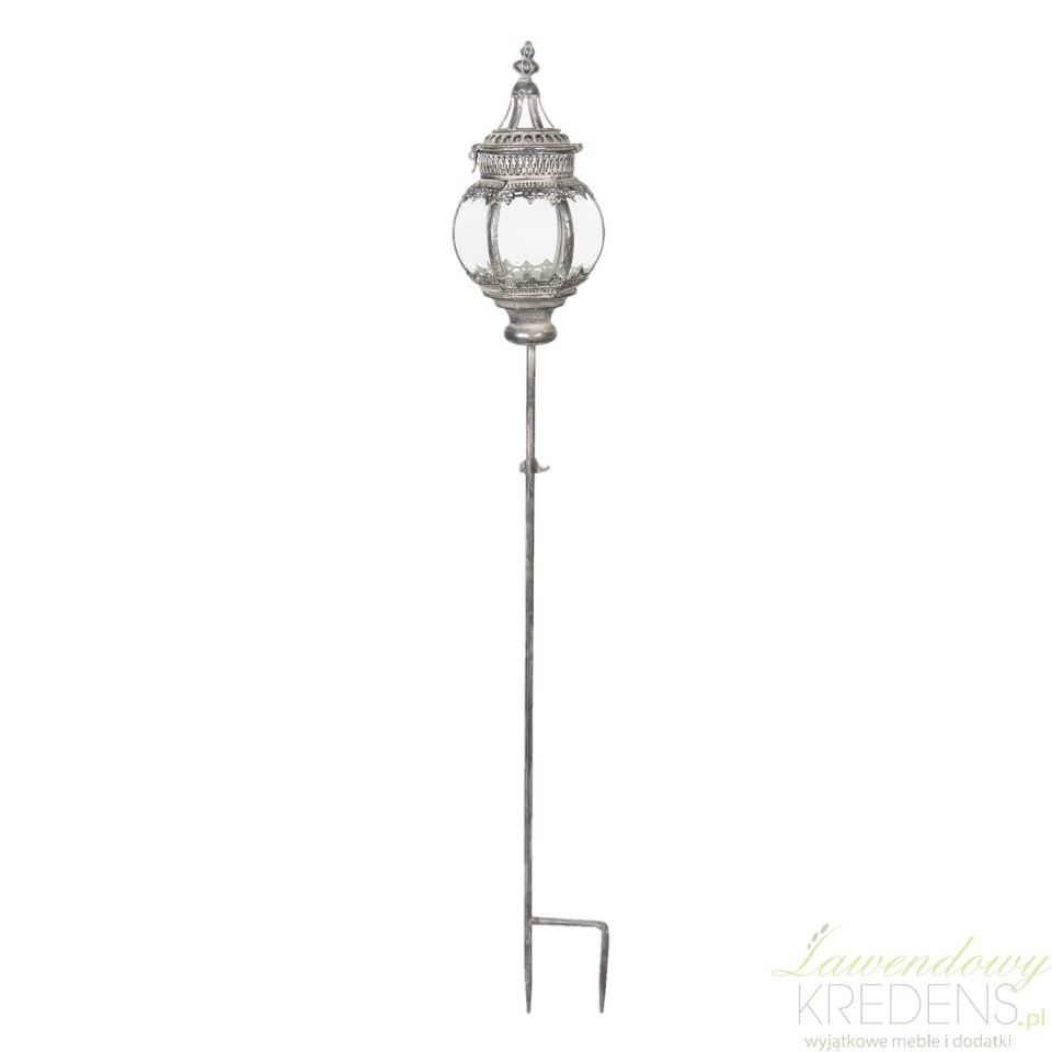 Najlepszym i jednocześnie romantycznym sposobem na oświetlenie ogrodu lub tarasu jest wykorzystanie latarenki do wbicia w ziemię. Metalowy lampion latarnia to fantastyczny element dekoracyjny do wykorzystania w codziennej aranżacji ogrodu jak również podczas garden party. Lampion zakończony jest szklanym kloszem w rzeźbionym, metalowym szkielecie. Dzięki delikatnym bieleniom świetnie wpisuje się w aranżacje prowansalskie, retro, shabby chic oraz boho.