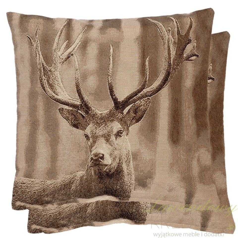 Kwadratowa poduszka z rogatym jeleniem na tle leśnej polany. Pasuje na brązową lub kremowa sofę w salonie.