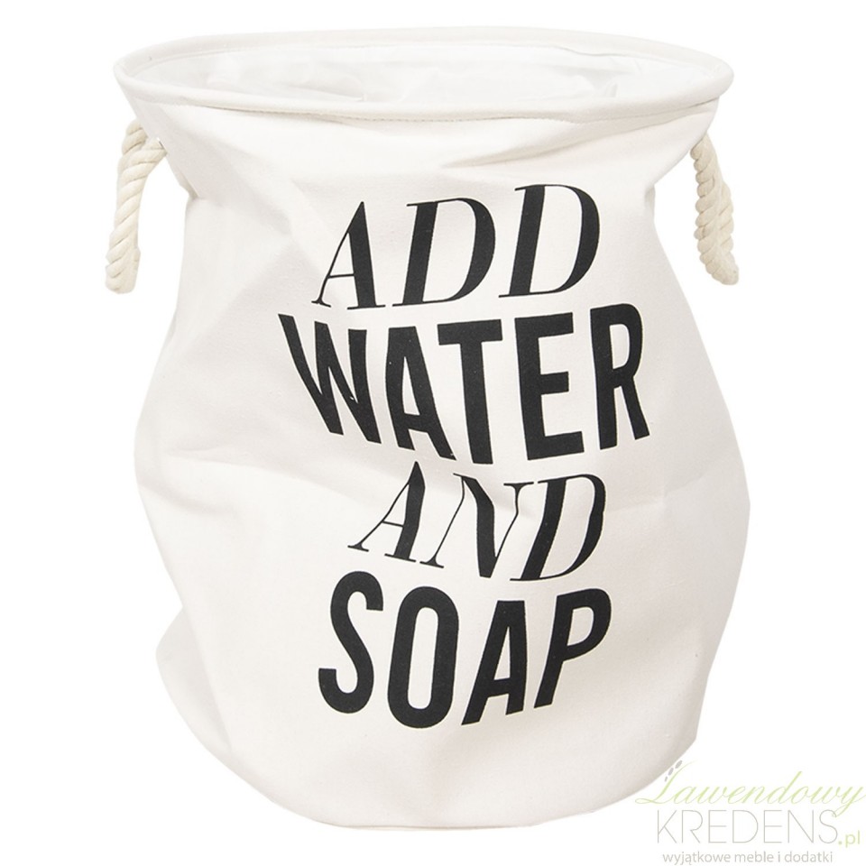 Bawełniany kosz na pranie Clayre&Eef zdobiony z zewnątrz czarnymi napisami. "Add water and soap". Kosz jest okrągły, ma biały kolor i praktyczne uchwyty ze sznura. Dzięki uniwersalnej kolorystyce pasuje do każdej łazienki. Kosz na pranie ustawiony w widocznym miejscu w łazience, ułatwi Ci przechowywanie brudnych skarpet i nie tylko.