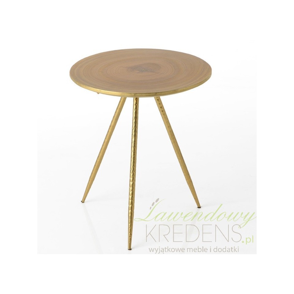 Funkcjonalny i wyrafinowany! Złoty stolik w minimalistycznej formie sprawdzi się w każdym wnętrzu loftowym i glamour Wytrzymała, metalowa konstrukcja z okrągłym blatem z drewna wyróżnia się swoją lekkością i jednocześnie solidnością. Cecha charakterystyczna tego modelu toi widoczne słoje na blacie. Prezentowane w naszym sklepie złote stoliki są kapitalnym miejscem na wazony z kolorowymi i zielonymi kwiatami.