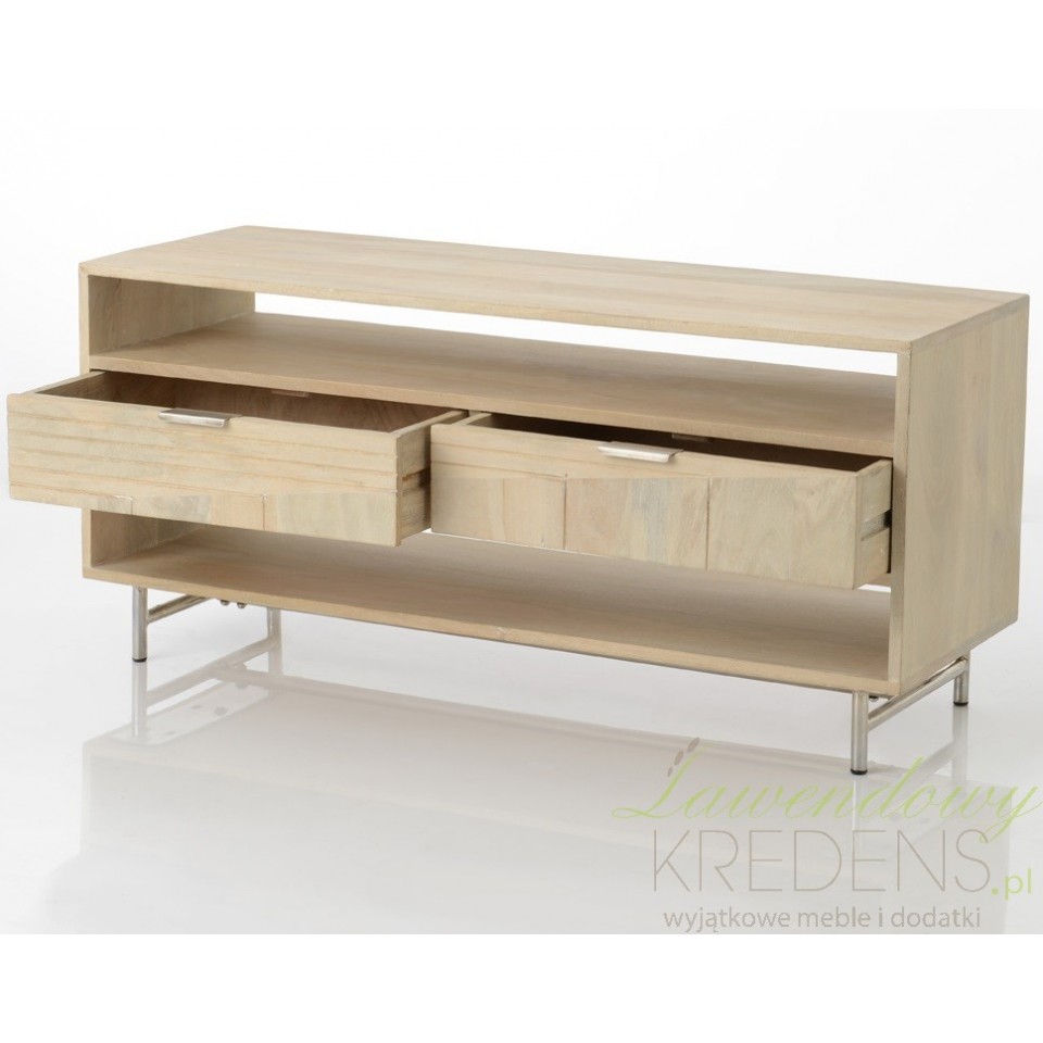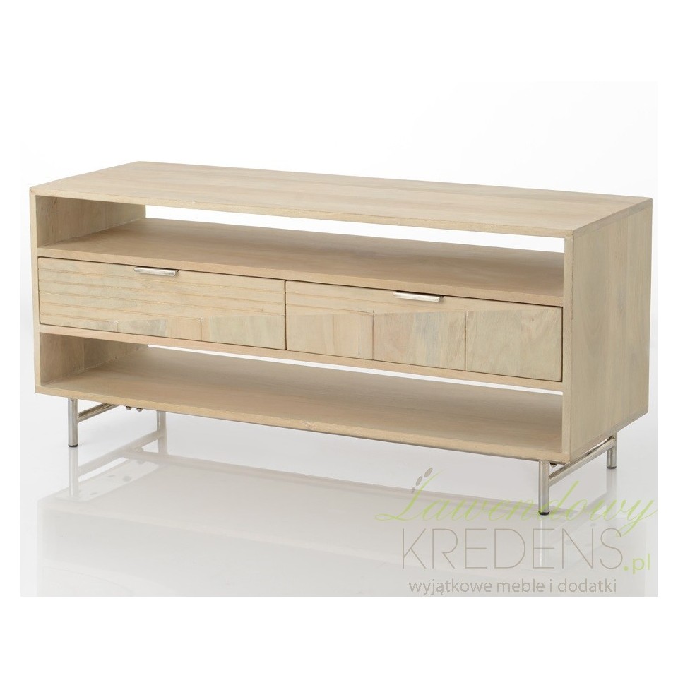 Elegancka i pojemna komoda pod telewizor doskonała również do przechowywania i eksponowania różnego rodzaju przedmiotów. Zawiera 2 szufladki i dwie półki, które pomagają utrzymać ład i porządek oraz ułatwiają przechowywanie płyt z filmami i innych akcesoriów. Atrakcyjny wygląd to zasługa jasnego drewna mango wykorzystanego do produkcji korpusu mebla i srebrnych, prostych nóg. Meble z drewna mango to świetny pomysł na urządzenie nowoczesnego salonu lub innego wnętrza w stylu skandynawskim.