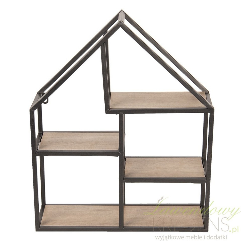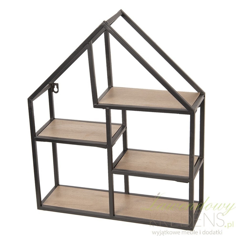 Półka ścienna z drewna i metalu doskonała do przechowywania kosmetyków w łazience, przypraw w kuchni i dekoracji w salonie. Wyposażona w cztery różnej wielkości półki drewniane oraz czarną konstrukcje metalową, kształtem przypomina domek. Opatentowana forma nie zajmuje dużo miejsca, a zapewni maksymalne wykorzystanie miejsca na ścianie. Półki ścienne w stylu loft rekomendujemy także do salonów urody w celu prezentacji markowych produktów.