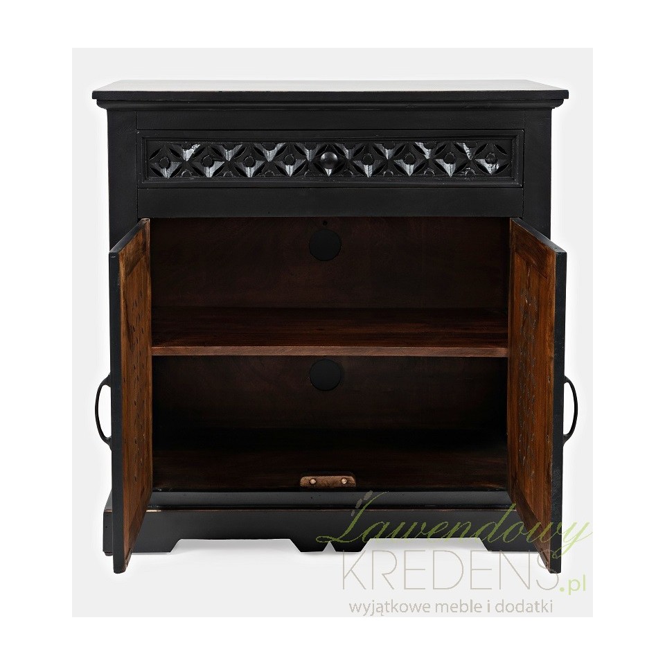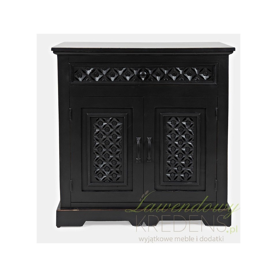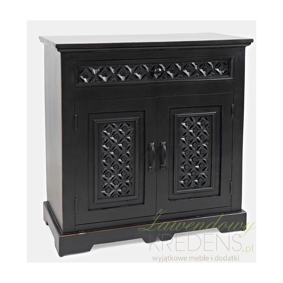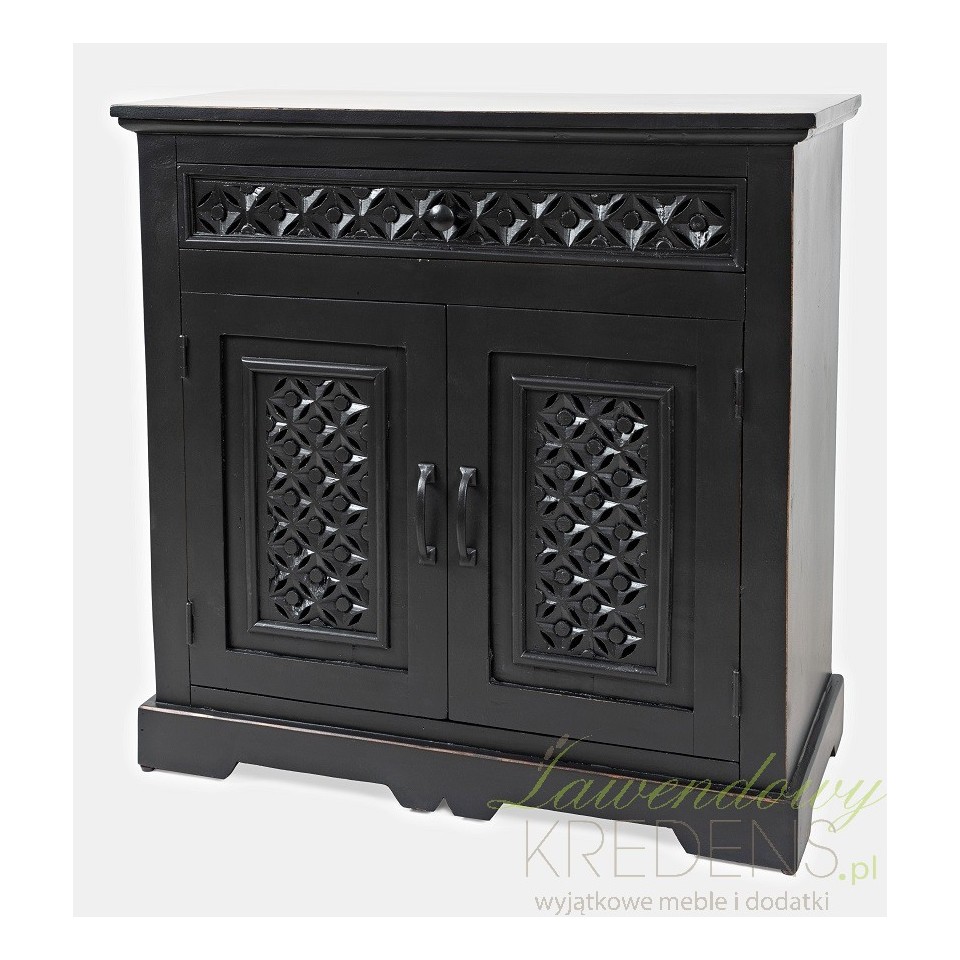 Komoda Avola w stylu prowansalskim zrobiona jest z trwałego drewna akacji, co gwarantuje Ci solidny mebel na lata. Efektowny wygląd mebla podkreślają ażurowe dekoracje na drzwiach i froncie pojedynczej szufladki. Czarna komoda w stylu prowansalskim została zaprojektowana w sposób umożliwiający jej maksymalną funkcjonalność - posiada wewnątrz półkę i poręczne uchwyty z metalu. Czarne meble to świetny wybór!