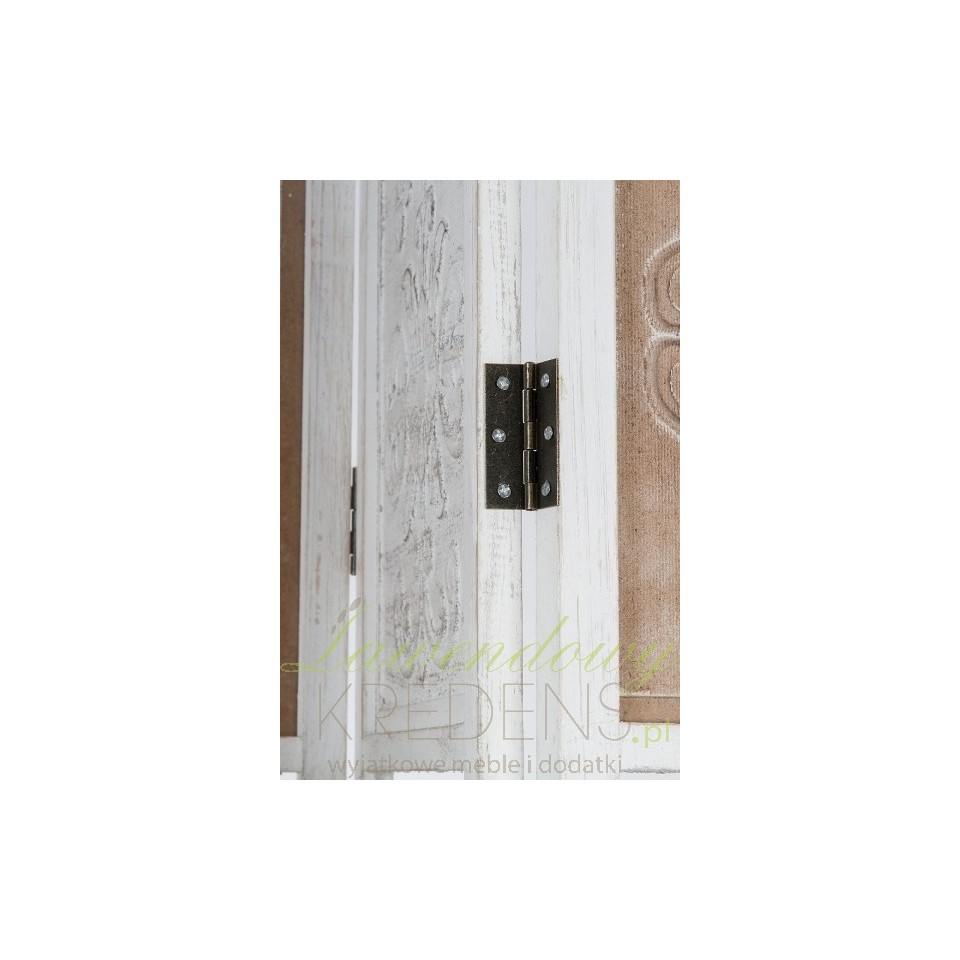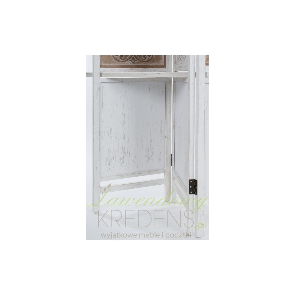 Biało-brązowy parawan prowansalski wykonany jest z drewna jodłowego i składa sie z czterech części połączonych ze sobą zawiasami.