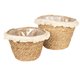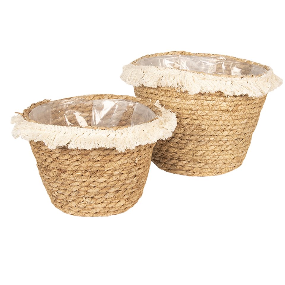 Przepiękne i niezwykle pomocne przy tworzeniu kwiatowych aranżacji plecione kosze. Dzięki tym pięknym osłonkom w ciekawy sposób wyeksponujesz kwiaty i inne rośliny. Każdy z koszy jest okrągły, ich brzegi wykończone są kremowymi frędzlami, a wnętrze wyścielane jest folią. Oba kosze plecione są wykonane z trawy morskiej.