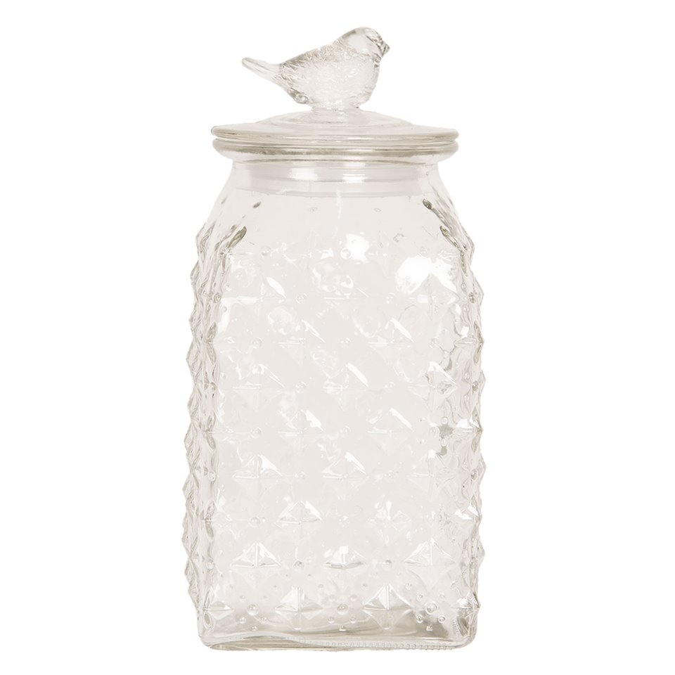 Szklane pojemniki kuchenne wyróżnia dekoracyjna przykrywka z uroczym ptaszkiem, mającym kolor antycznej bieli.