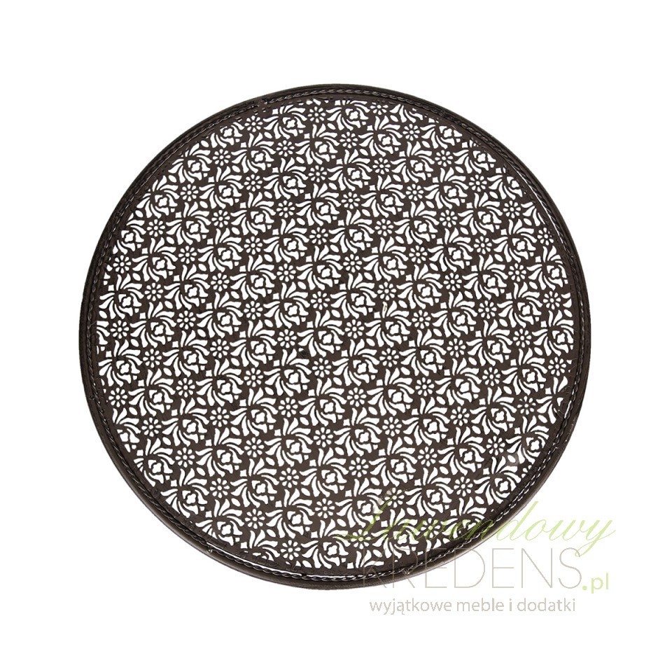 Prezentowane meble ogrodowe wyróżnia ciemny kolor, ciekawe uformowania na oparciach krzeseł oraz ażurowy blat i ażurowe siedziska krzeseł.