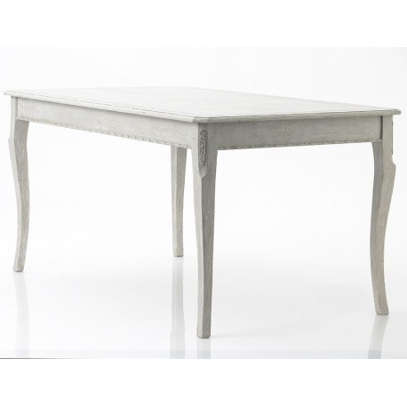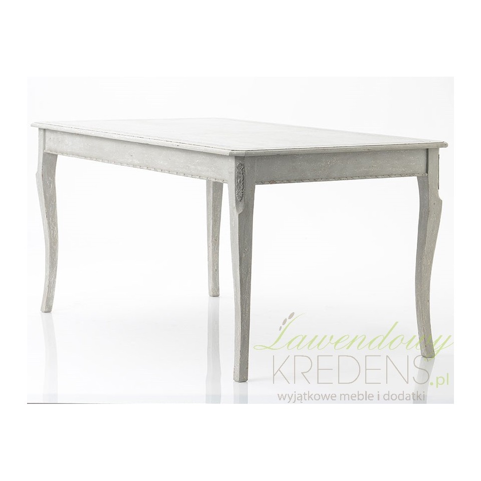 Duży stół postarzany do jadalni lub do salonu wyróżnia się lekką formą, której nadają mu subtelnie ugięte nogi i wyraziste zdobienia na krawędziach.