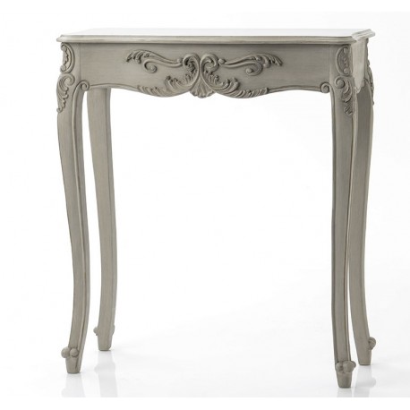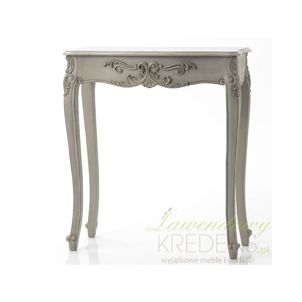 Wyjątkowa, szara konsola w stylu francuskim z rzeźbieniem ma smukłe nogi o opływowym kształcie i obszerny blat roboczy.