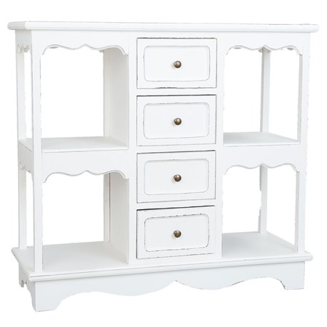 Sięgająca wysokości jednego metra komoda w stylu prowansalskim to interesujący mebel o funkcjonalnej formie. Wyposażona w 4 szufladki i półki pomieści bardzo dużą liczbę książek, dekoracji, donic z kwiatami lub ramek na zdjęcia. Do każdej szufladki przymocowano metalowy, okrągły uchwyt. Biała komoda wygląda interesująco dzięki miejscowym przecierkom.