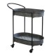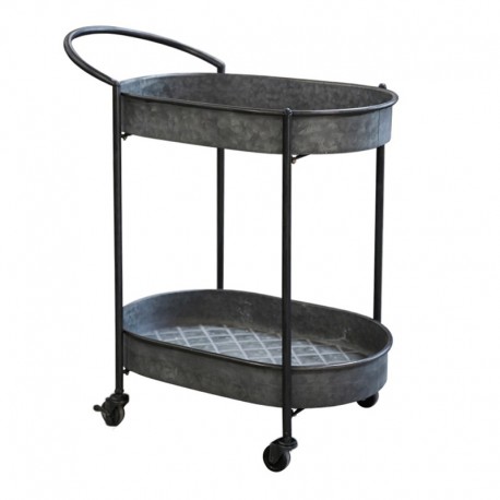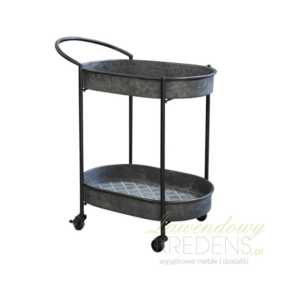 Metalowy stolik na kółkach w całości wykonany z wysokiej jakości surowca. Wyposażony został w ruchome, cztery kółka, dwie półki otoczone wysokim rantem, zabezpieczającym przedmioty przed spadaniem na ziemię. Powierzchnia wózka jest matowa, ma grafitowy kolor i przebarwienia. Metalowy wózek Chic Antique z rączką do sterowania to funkcjonalny element wyposażenia biura, gabinetu i biblioteki.