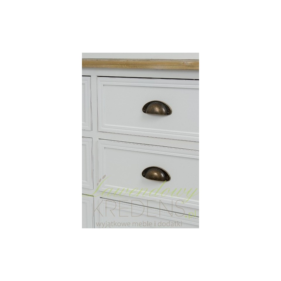 Pojemny kredens w stylu prowansalskim z szafkami i szufladami, w których zmieścisz wszystko to, czego nie potrzebujesz eksponować. Wykonany z drewna i MDF kredens prowansalski ma kolor biały w półmacie oraz brązowe blaty. Nad blatem roboczym zamocowane są metalowe haczyki, na których możesz zawiesić ścierki lub kubki. Stylowo zagospodarowane kredensy w stylu prowansalskim będą swoistą dekoracją dla całego wnętrza.