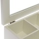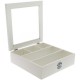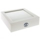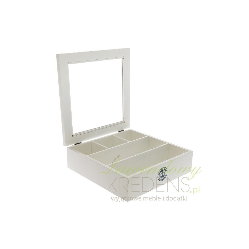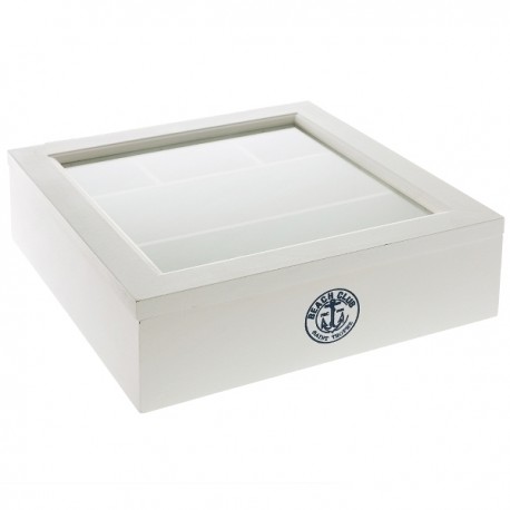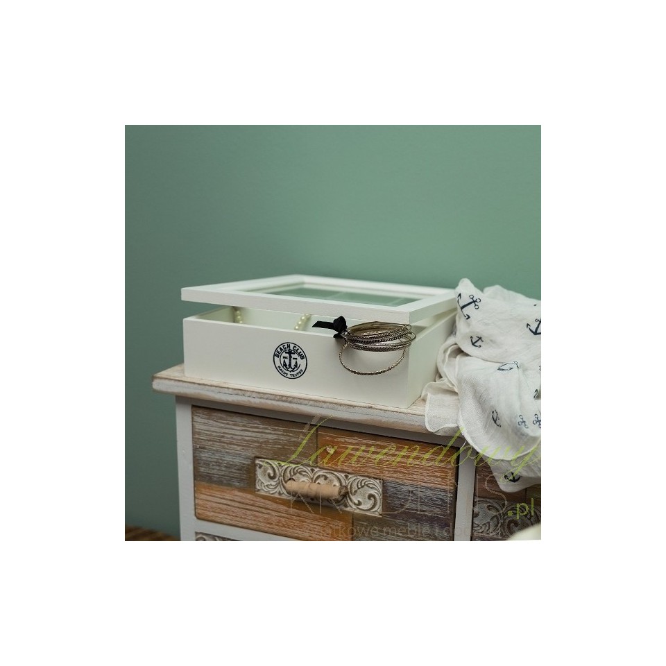 Wykonany z drewna pojemnik w stylu marynistycznym pomieści przybory do szycia, pocztówki i pamiątki z nadmorskich podróży. Oprócz tego, biały pojemnik z szybką będzie świetnym miejscem do przechowywania biżuterii. Drewniany pojemnik jest kwadratowy i bardzo pojemny – posiada liczne przegródki wewnątrz. Na froncie pojemnika znajduje się gustowna grafika z kotwica w kolorze granatowym.