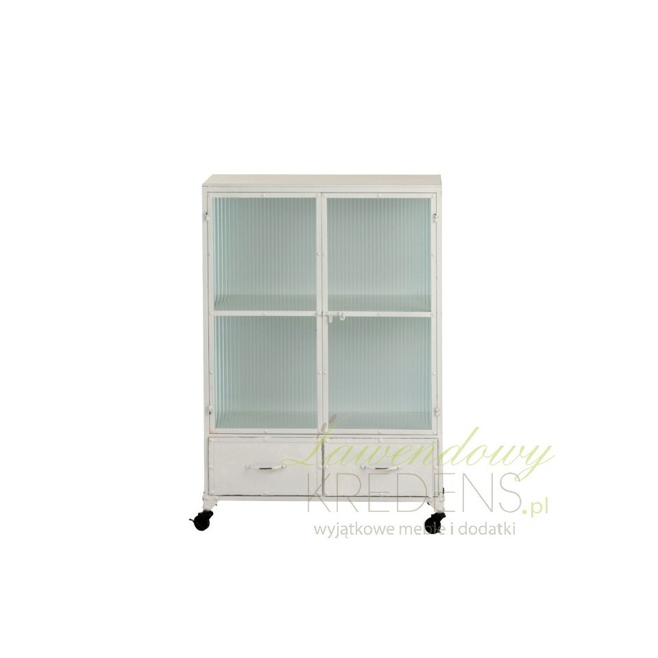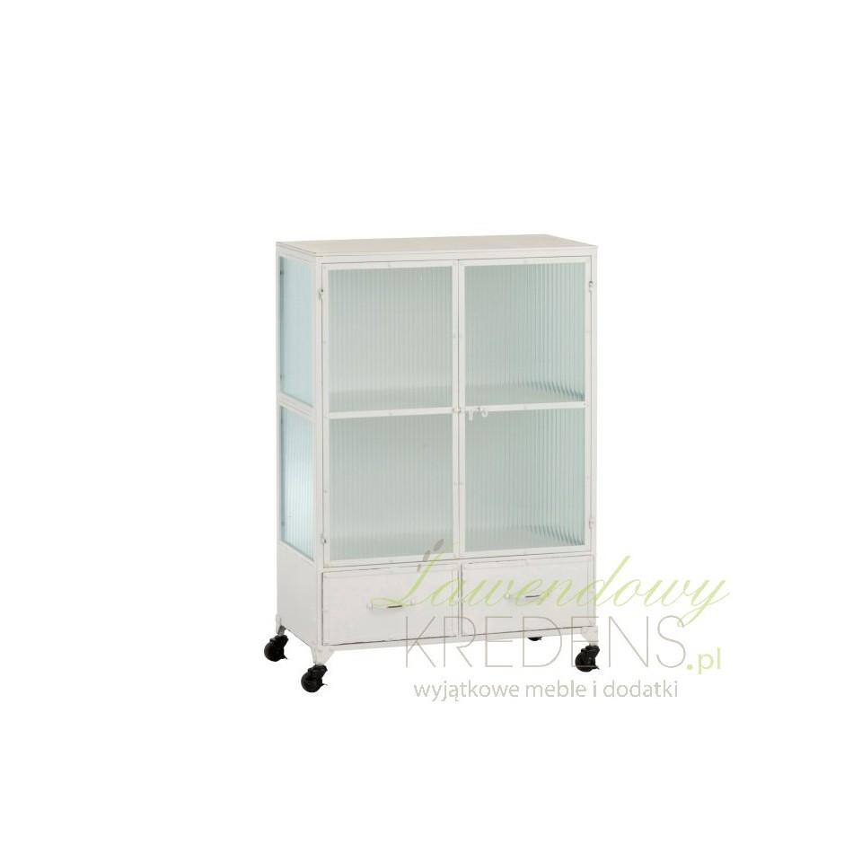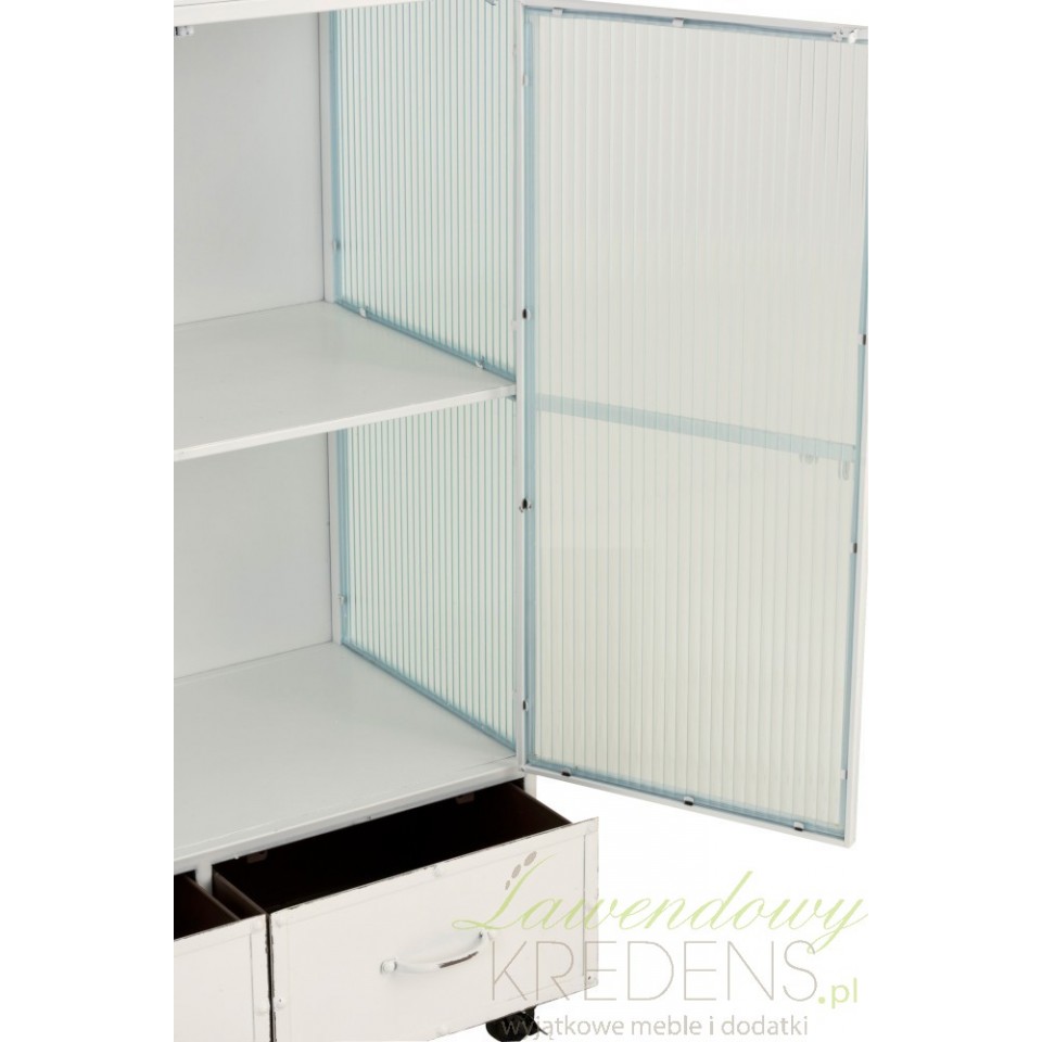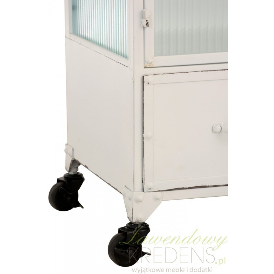 Komoda w stylu industrialnym to mebel dla tych, którzy nie mogą zdecydować się między szafą a półkami. Przeszklona komoda wyposażona jest w dwie szuflady i cztery kółka, a miejsce wewnątrz stanowi pojedyncza półka. Komodę wykonano z metalu i pomalowano na biało. Wytrzymały materiał gwarantuje satysfakcję z korzystania ze wszystkich funkcjonalności prezentowanego mebla.