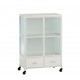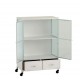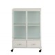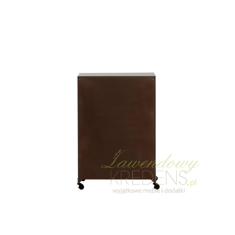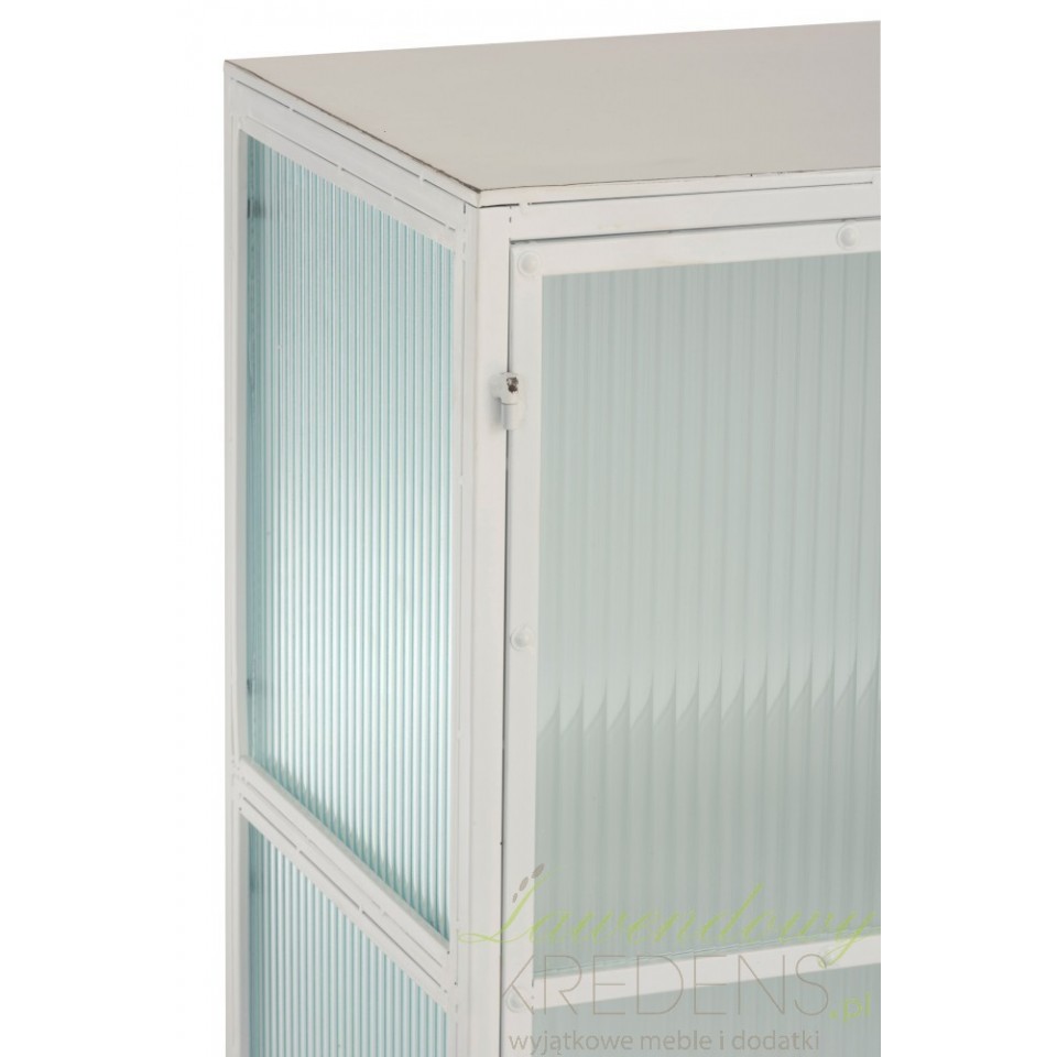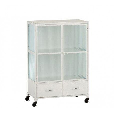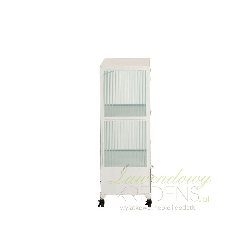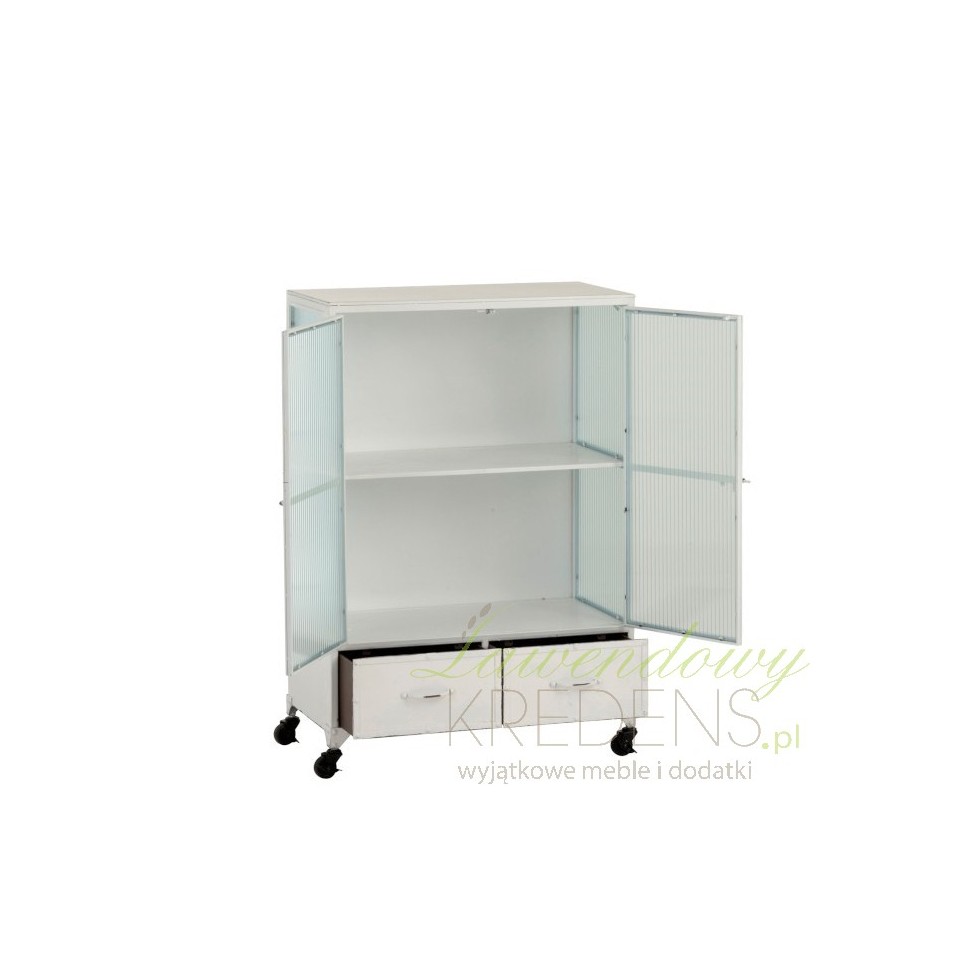 Komoda w stylu industrialnym to mebel dla tych, którzy nie mogą zdecydować się między szafą a półkami. Przeszklona komoda wyposażona jest w dwie szuflady i cztery kółka, a miejsce wewnątrz stanowi pojedyncza półka. Komodę wykonano z metalu i pomalowano na biało. Wytrzymały materiał gwarantuje satysfakcję z korzystania ze wszystkich funkcjonalności prezentowanego mebla.