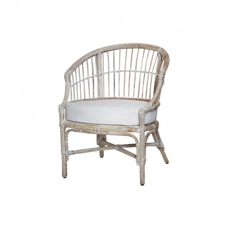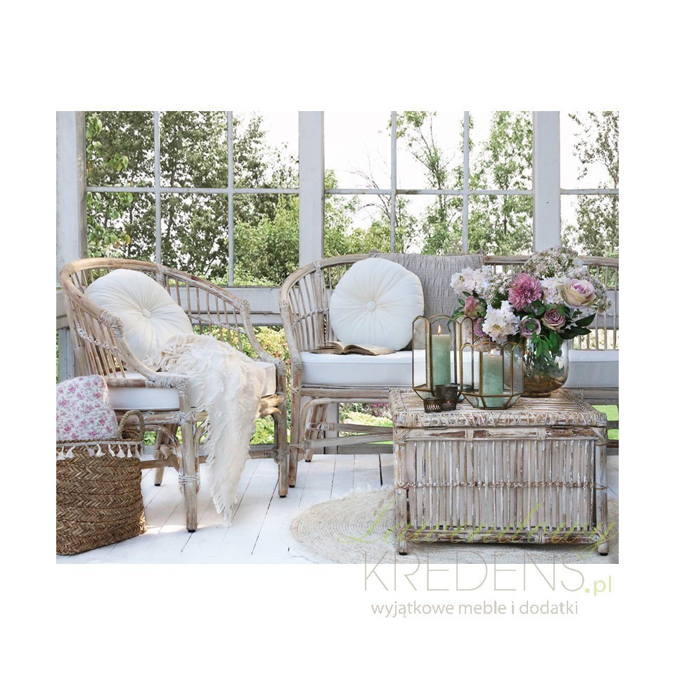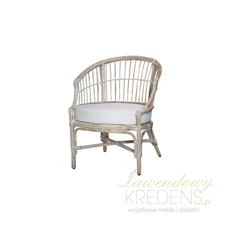 Krzesło rattanowe zostało zaprojektowane z myślą o miłośnikach sielskiego designu. Idealnie sprawdzi się zarówno w dużym salonie, jak również na zadaszonym tarasie bądź balkonie. Krzesło ma jasnobrązowy kolor, dodatkowo zostało pobielone, a na jego siedzisku umieszczono miękką poduszkę w kremowym kolorze. Rattanowe meble Chic Antique łączą w sobie lekkość rattanu z solidną konstrukcją.