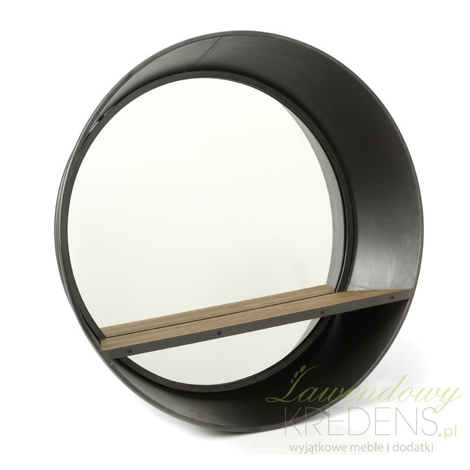 Duże lustro industrialne okrągłe z półką drewnianą oferuje ciekawe urozmaicenie wnętrz w stylu retro, vintage, skandynawskich i loftowych.